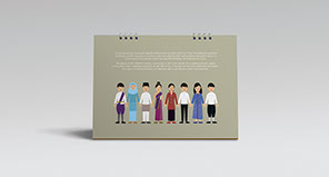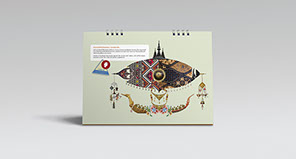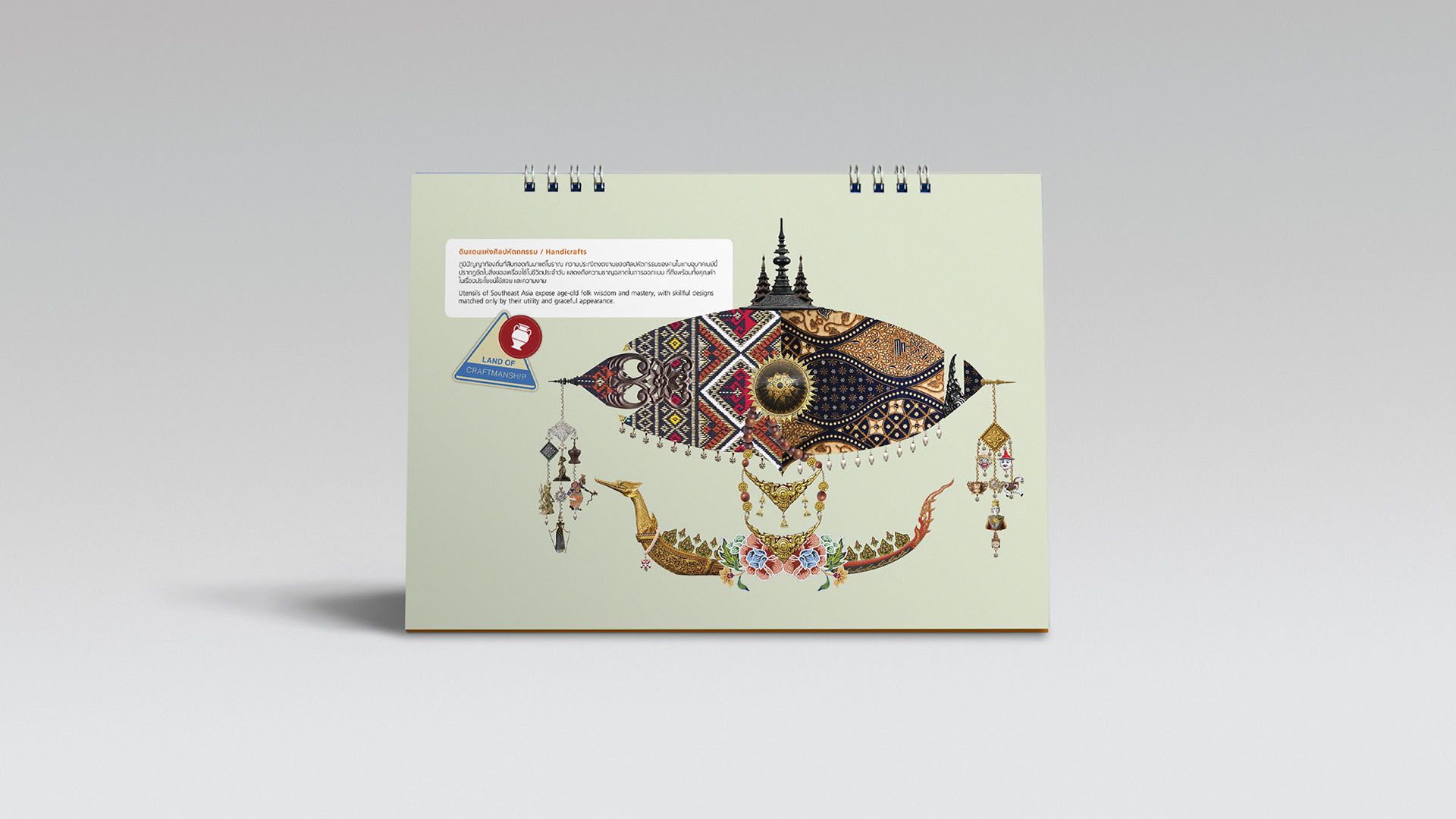 As we looked to the goal of the ASEAN Community vision, “One Vision, One Identity, One Community”, we chose to depict the subject in a slightly unconventional way. Our idea was to allow the spirit of this community to take center stage and enhance the opportunity arisen from this unity to shine. We created 12 illustrations to celebrate the strength of the regional integration in different aspects–visualizing the theme of each ranging from art, culture, economy, and geography, such as prosperity of natural resources, exquisite cuisines, world-renowned tourist destinations or joyful cultural festivals and ceremonies. Each illustration derived from each iconic attribute of AEC member countries to form a big picture. We employed diverse illustration techniques from collage, paper sculpture to vector illustration. Inspired by the theme journey, we designed a special icon for each page to mark as a passport stamp, while the cover resembles a well-traveled leather suitcase covered with travel stickers and luggage tags. The calendar is a unique visual narrative and pleasant journey to AEC.