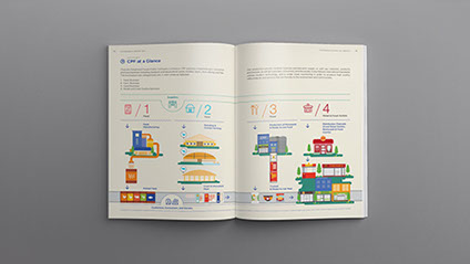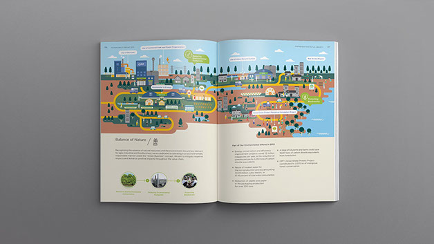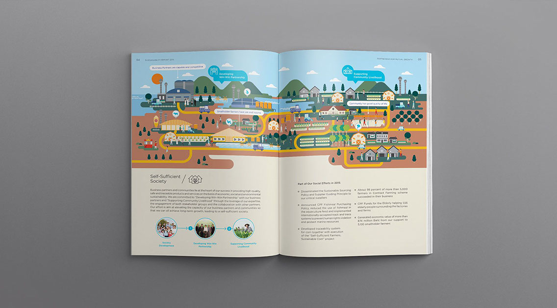 Our goal was to project the whole pathway of CPF’s operations to sustainability from beginning to end: production of animal feed, breeding and animal farming, production of processed and ready-to-eat food to food retail outlets and restaurants. Every detail of illustration reflects CPF’s commitment and dedication to community, society, and environment. The long chain of information and jargon was made less complex and accessible by bright and warm coloured illustration which has been carefully crafted for clear understanding.