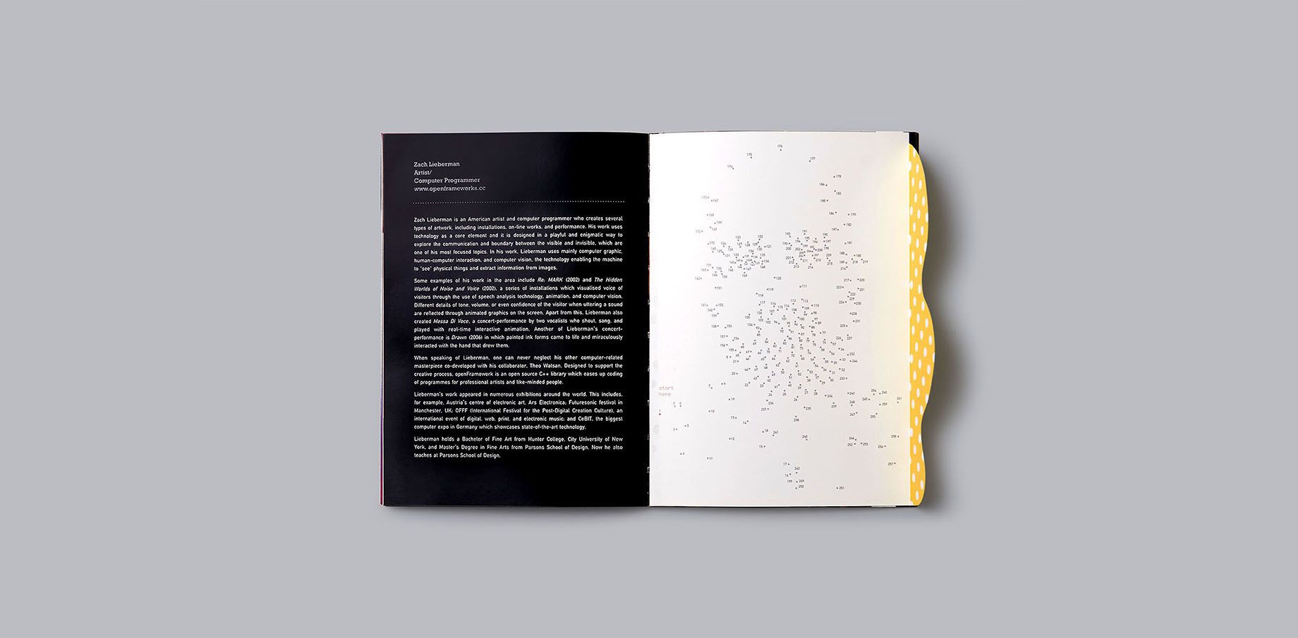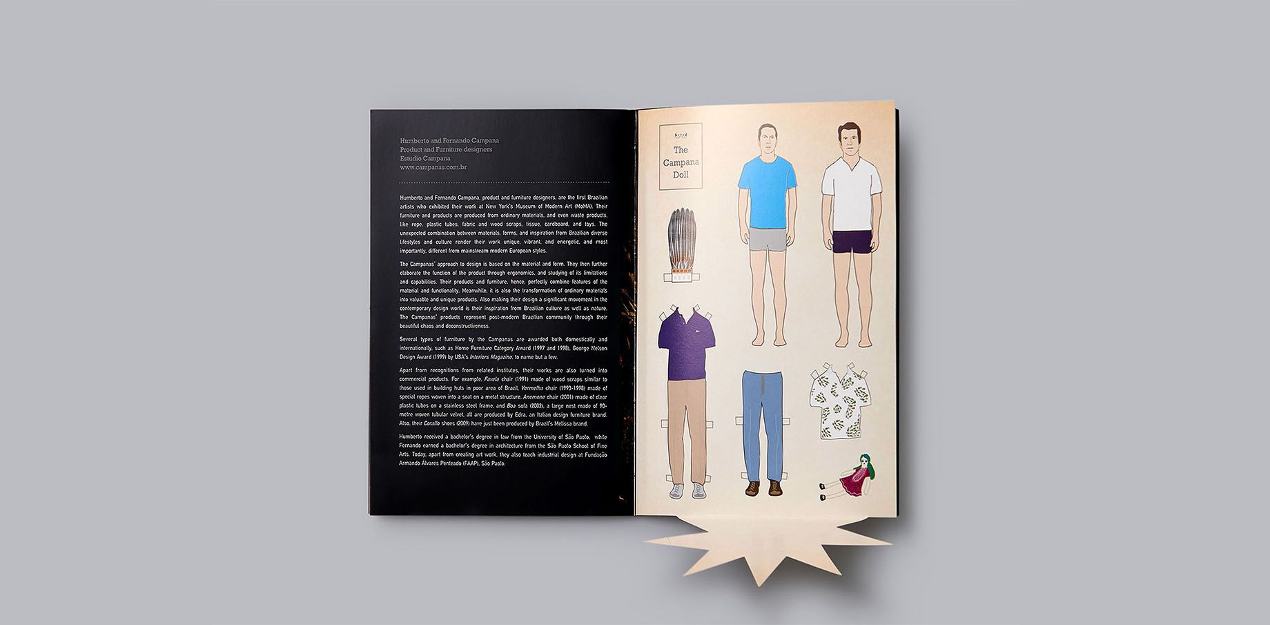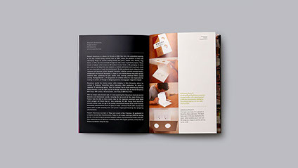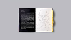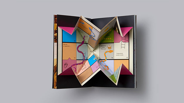 Working around the concept of work and play, our strategy was to imply the inseparable dimension of working in play and playing at work. The playful interaction echoed continuously throughout the catalog in relation to the contents. Using games, pop-up, 3D glass and flaps to reflect the works of each speaker, our goal was to enhance the big idea. For the cover, we used heavy type ornament with gold embossing, while inside provided a sticker sheet to break the formal tone of the outside.