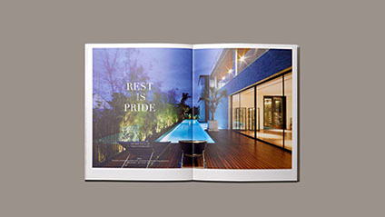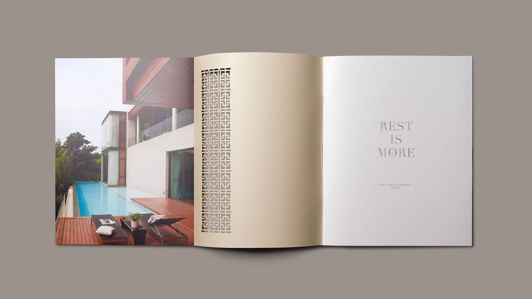 Rest is More is a custom sale kit designed to showcase an 800 sqm residence, built on the principle of relaxation in the Sukhumvit area. We designed a sale book that was striking in its calm, stylish tranquility to reflect the concept of the house including its interior design and amenities where the residents’ quality of life is the priority. The booklet entices its prospective buyers with peerless design and function of the house, utterly conducive to relaxation in every moment and corners, through the use of featured full-colour photographs. Inspired by a unique detail of the Chinese wood lattice panel, we formed a distinct personality of typography and graphic element to complete clean and minimal layouts. Printing and production techniques help make the sale kit feel special on the final touch with gatefold and die-cut cover, subtle gold colour, and quality paper stock.
