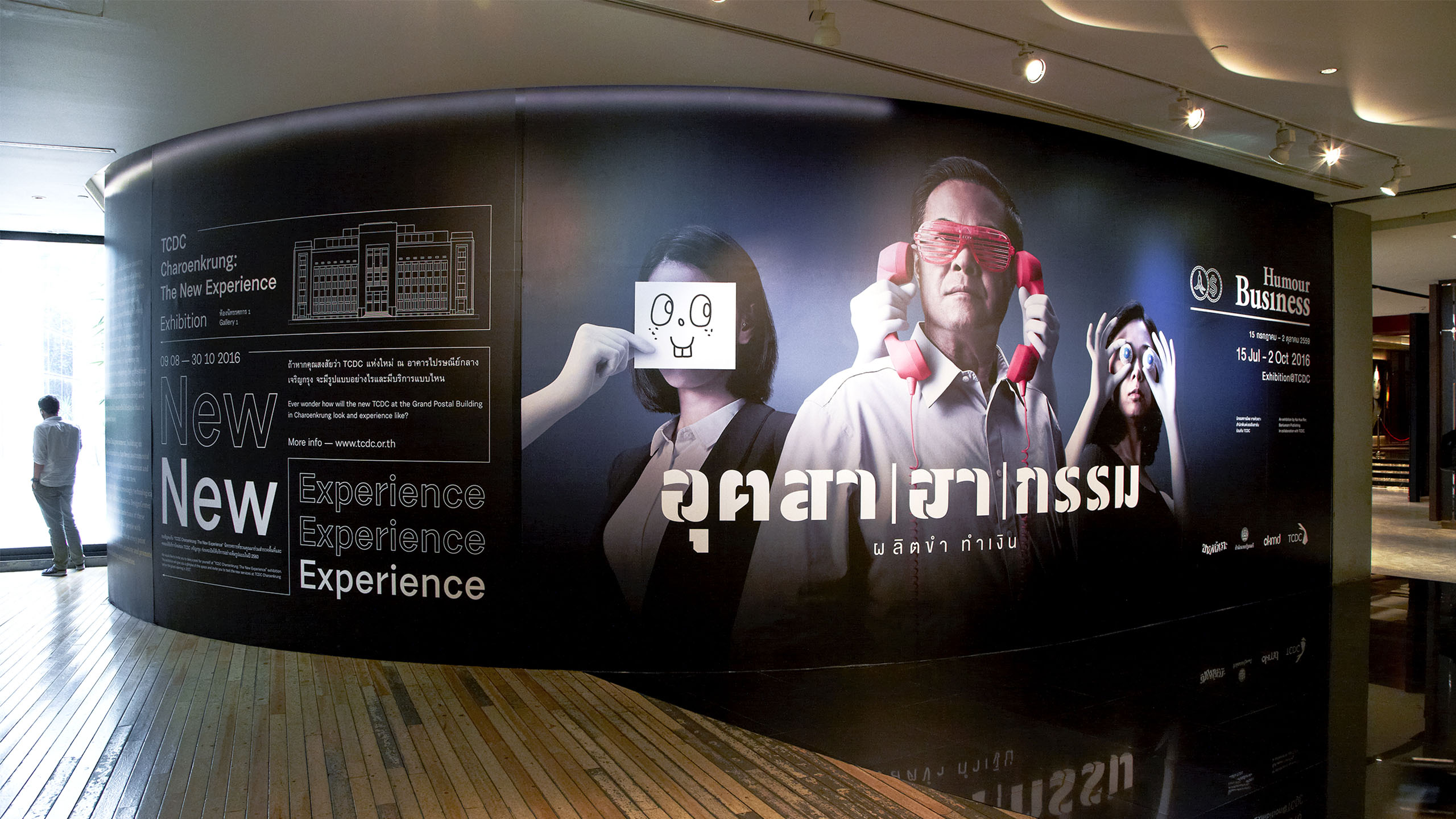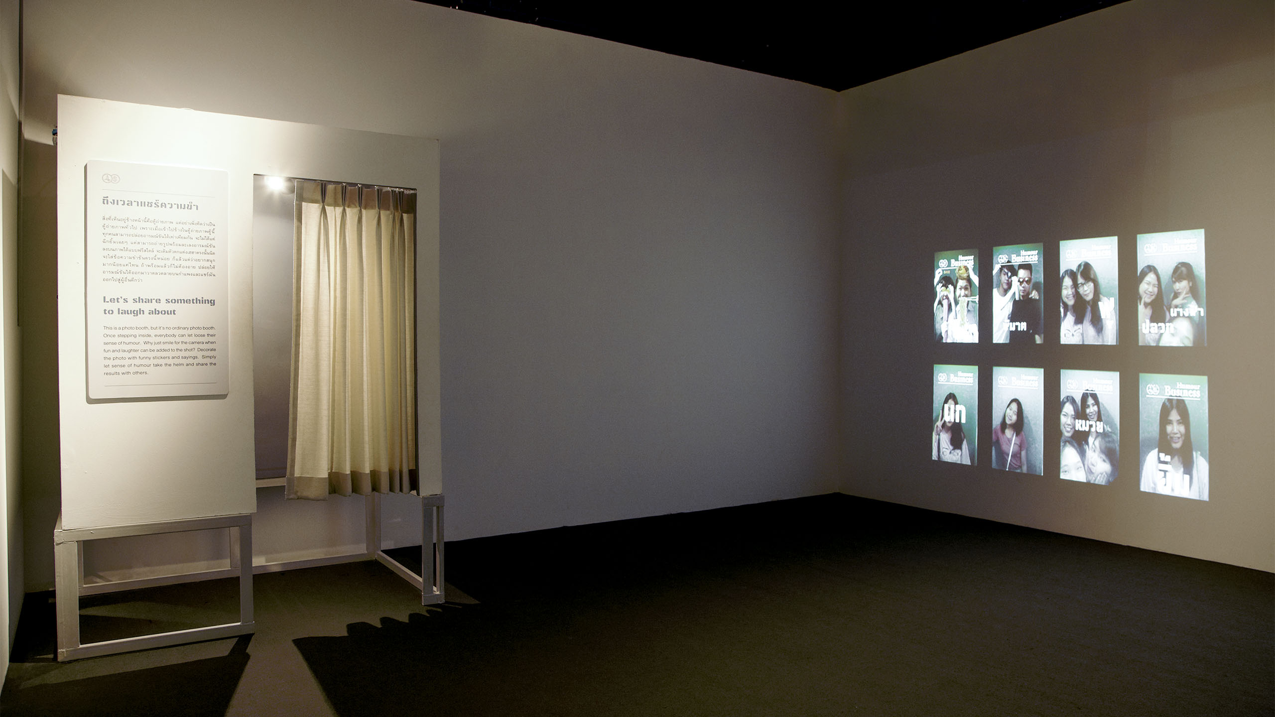 This exhibition was to exhibit our attempt to break all expectation and play around with unexpected emotion – just like how humour works. We, first, prioritized with the design of logo and key visual for “Business” and “Humour” part was followed. In front of the exhibition, it seems to be a serious one but after the audience walked it though, they’d realized that it wasn’t serious at all. The signage system of “Humour Business” exhibition mocks a boring corporate identity system that use their logo on every single thing. Moreover, we put various secret facilities in TCDC gallery such as the humour business history hallway, secret ingredients warehouse, a production line, a sub-level lift, a factory side alley, and the most surprisingly - a photo booth.