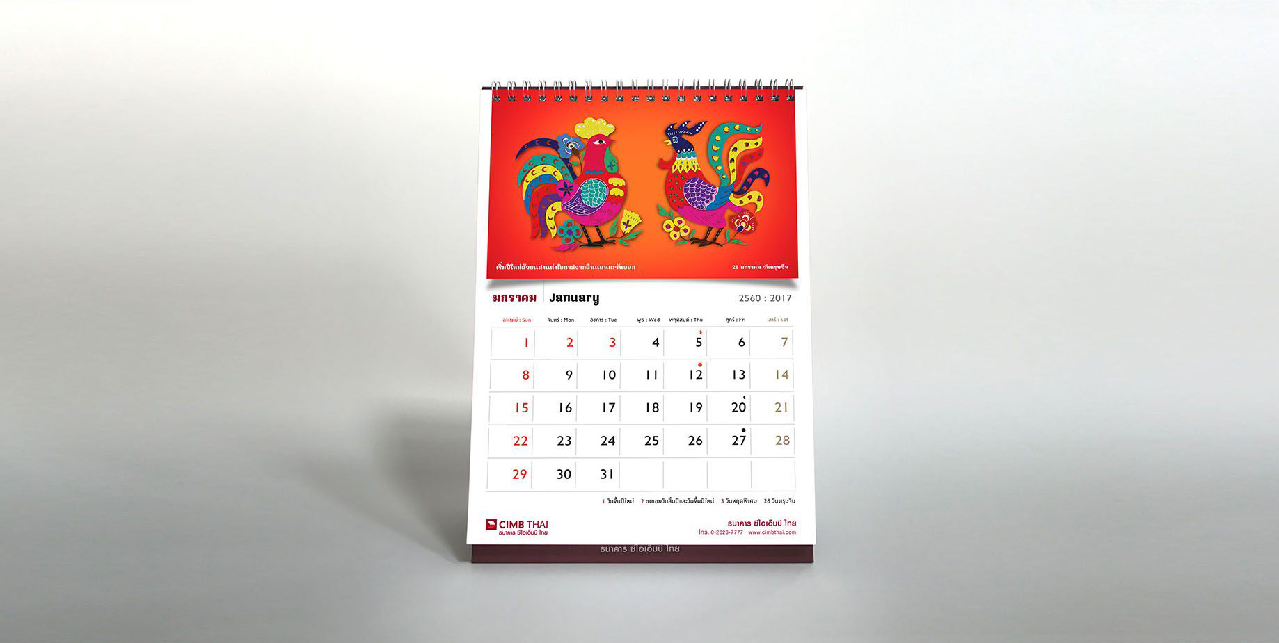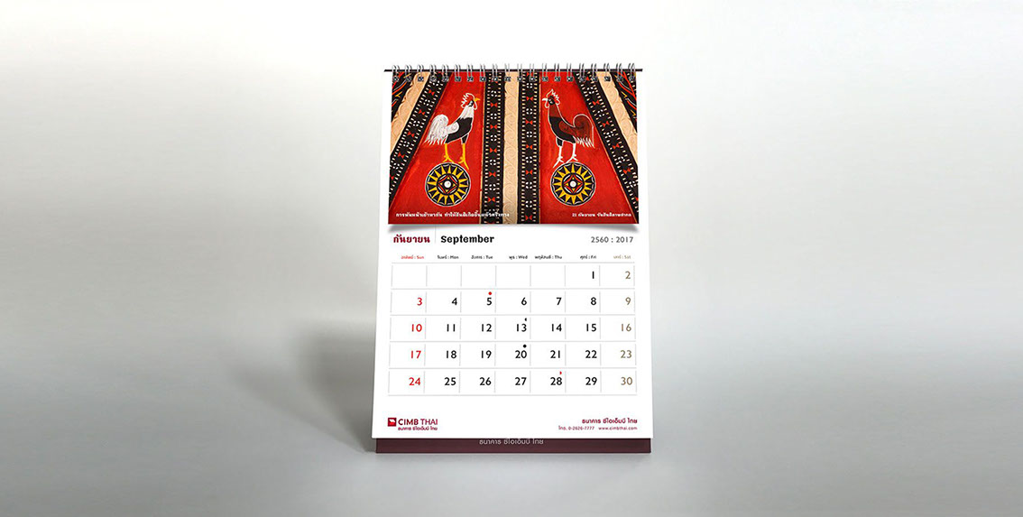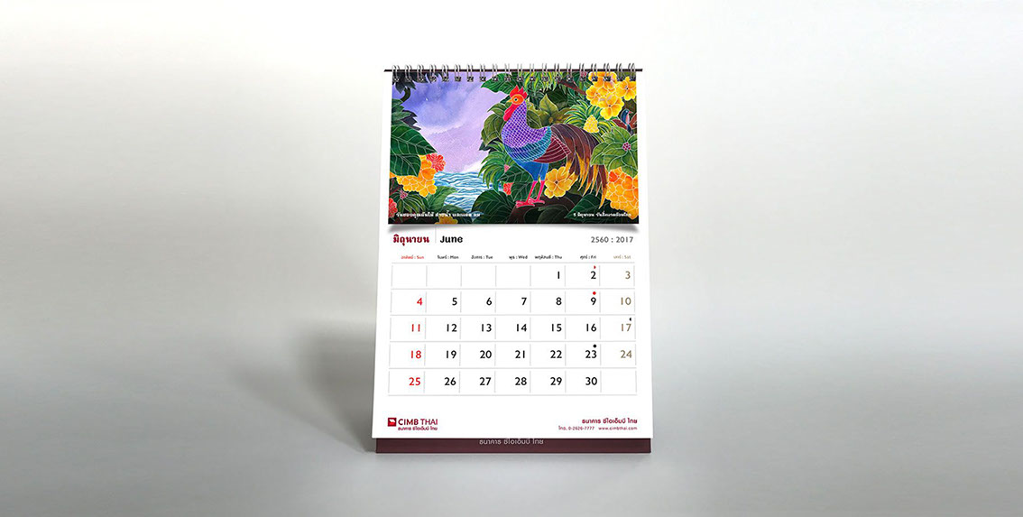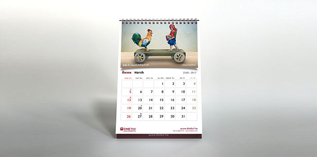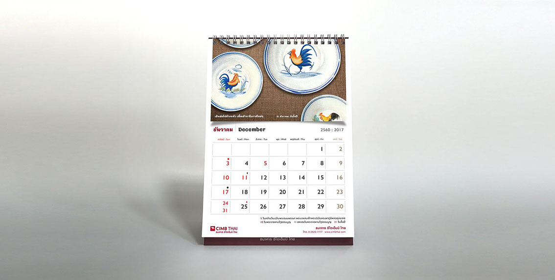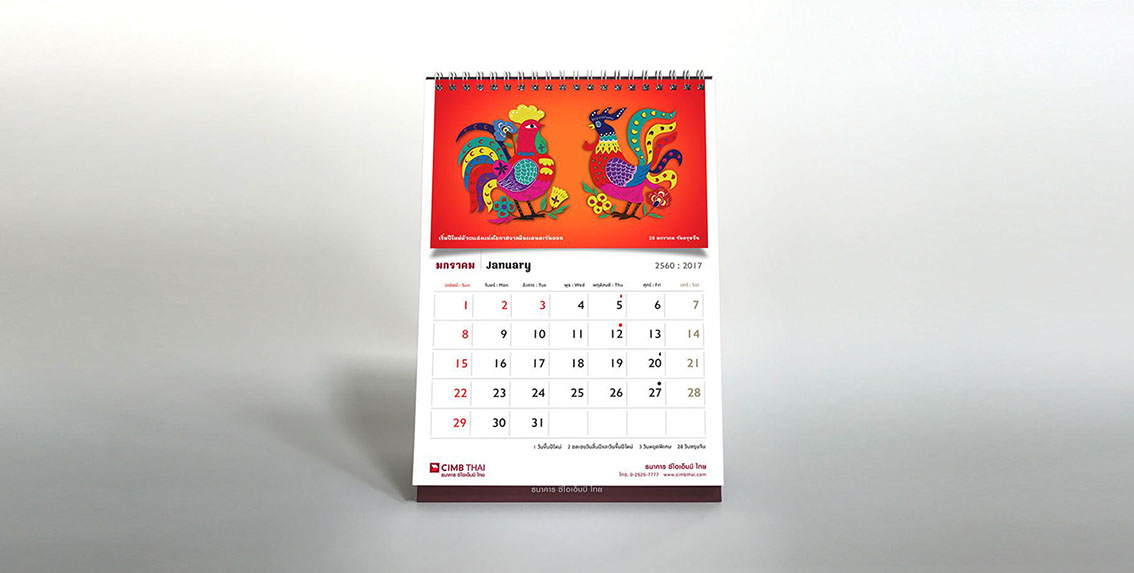 As the sole of the bank lies in the foundation of ASEAN culture, art, and tradition, the concept for the calendar is inspired by the sign of Chinese zodiac corresponding to the year 2017, a rooster. The rooster has long been considered a sacred animal in some cultures and deeply embedded within various religious and spiritual beliefs dated back to a period of Greek history since about 700 B.C. As Year of the Rooster dawns, it brings prosperity, victory, and abundance. The calendar features a selection of rooster pictures in different context demonstrated the symbolic use of rooster in our daily life across the region. The featured pictures on a different texture and medium reflect the story of an important national or international day in each month such as Valentine's Day, Thai Family Day or International Women’s Day. The outcome echos CIMB Thai standpoint as the Bank who truly know ASEAN, the way of life, their belief and faith.
