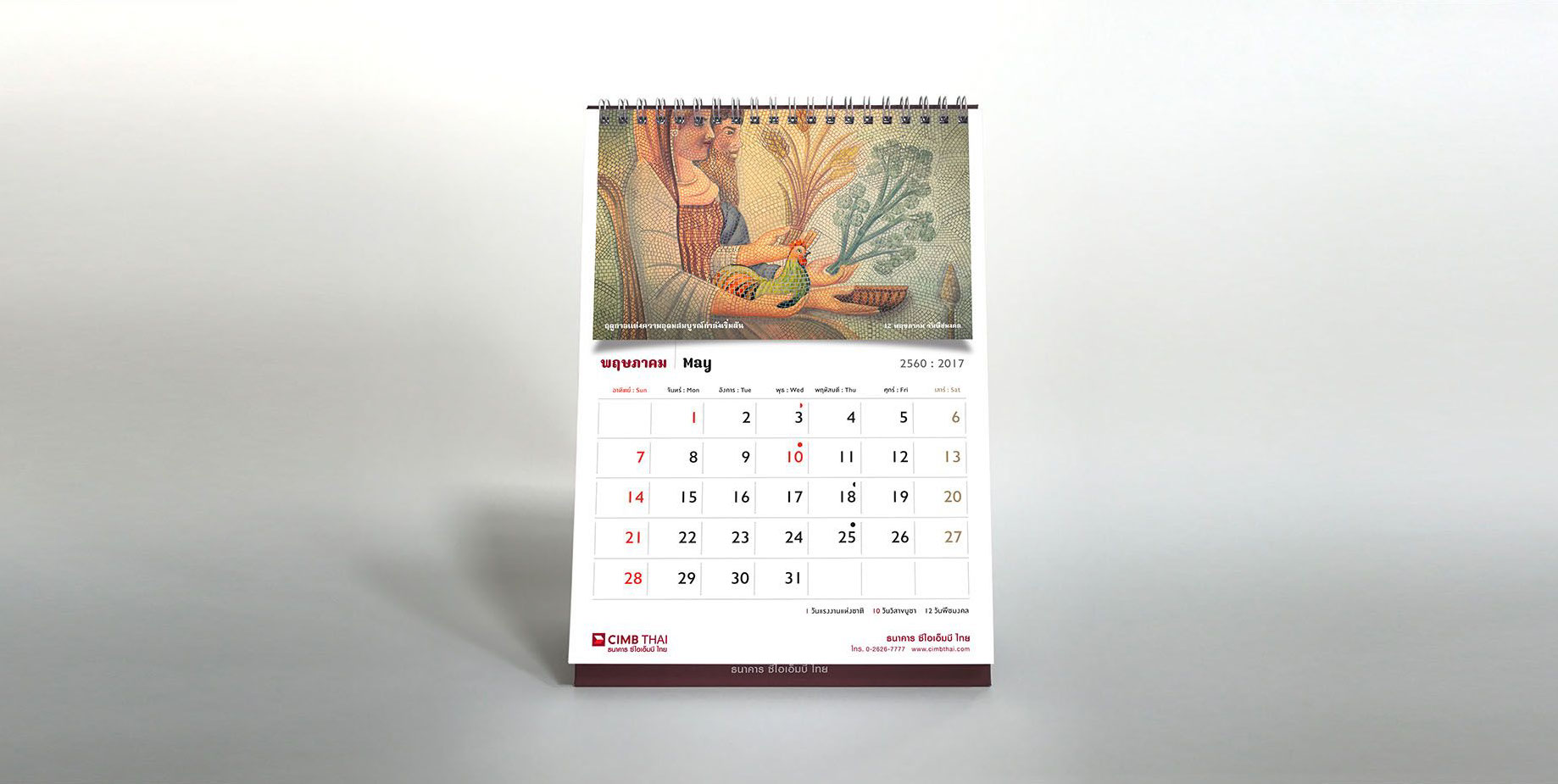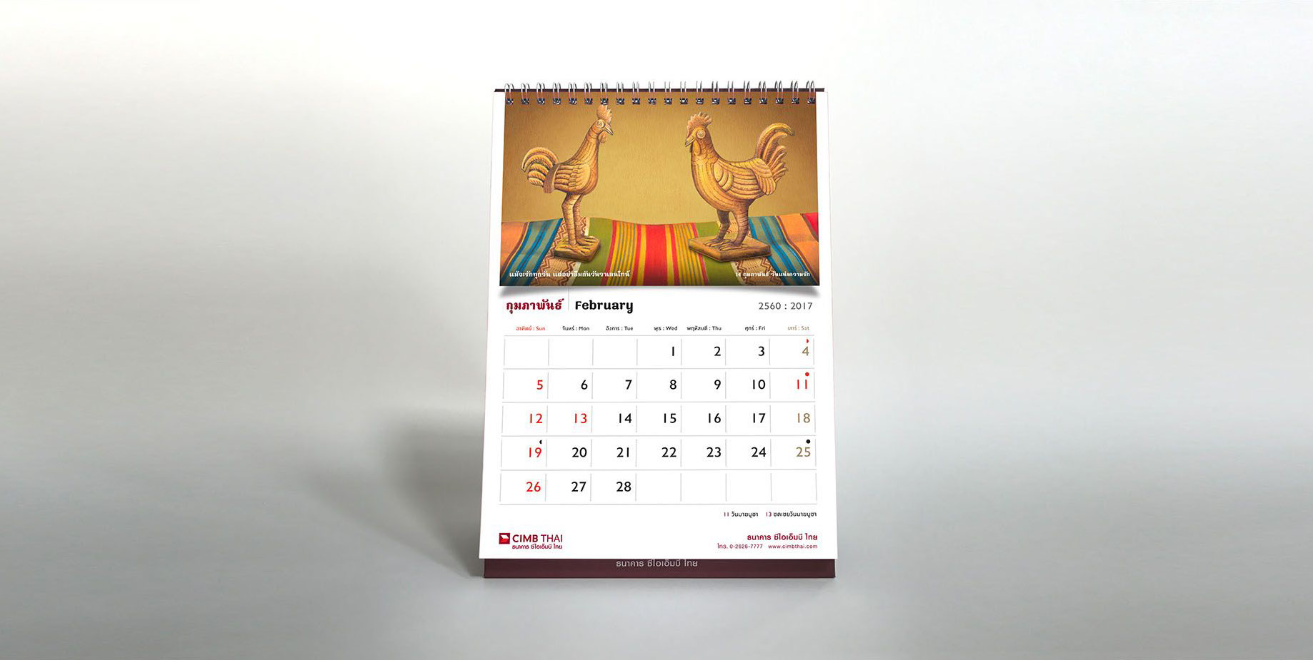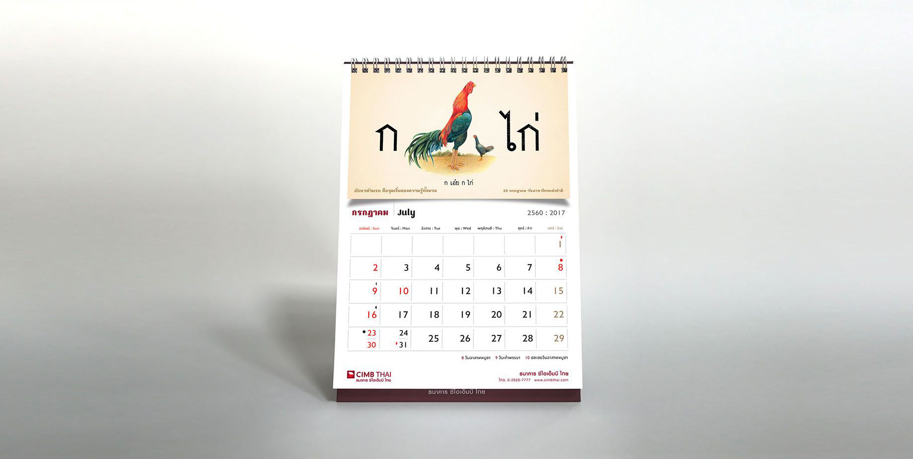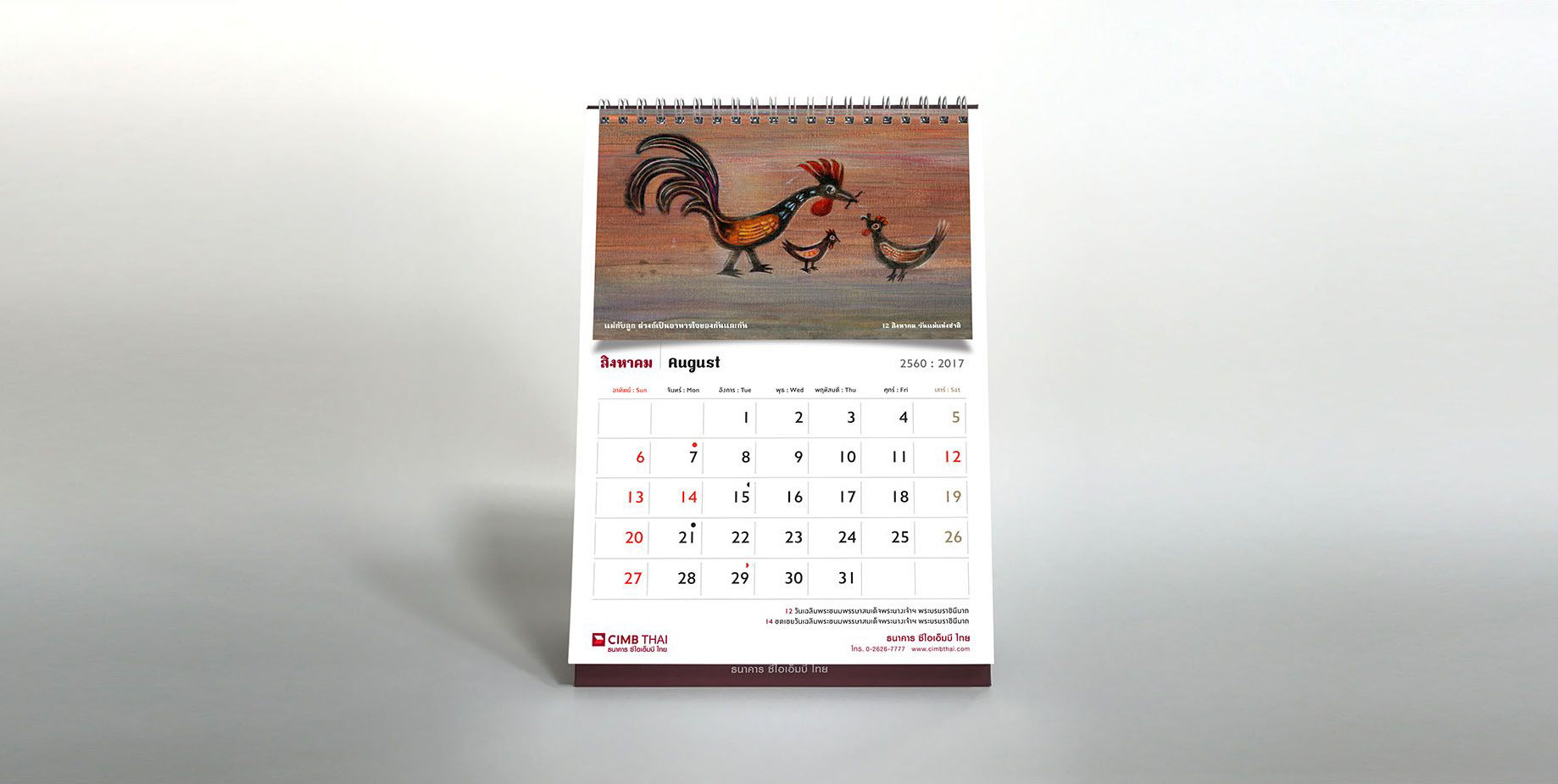 As the sole of the bank lies in the foundation of ASEAN culture, art, and tradition, the concept for the calendar is inspired by the sign of Chinese zodiac corresponding to the year 2017, a rooster. The rooster has long been considered a sacred animal in some cultures and deeply embedded within various religious and spiritual beliefs dated back to a period of Greek history since about 700 B.C. As Year of the Rooster dawns, it brings prosperity, victory, and abundance. The calendar features a selection of rooster pictures in different context demonstrated the symbolic use of rooster in our daily life across the region. The featured pictures on a different texture and medium reflect the story of an important national or international day in each month such as Valentine's Day, Thai Family Day or International Women’s Day. The outcome echos CIMB Thai standpoint as the Bank who truly know ASEAN, the way of life, their belief and faith.
