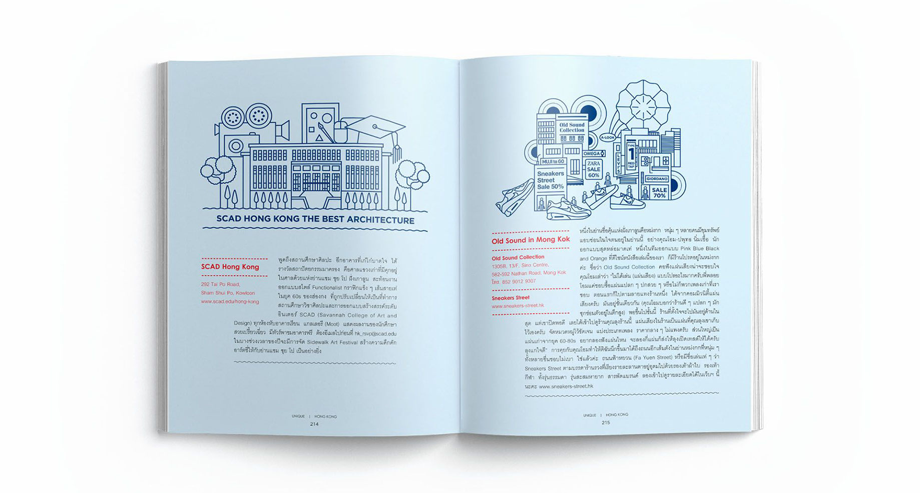 Unique Hong Kong is a travel guide book on the premise that it will lead you to the new inspiring places through the eyes of a guru. It is an ultimate resource for travelers who want to experience Hong Kong in a new and unique way. We captured the essence of this guide book and vividly portrayed through a series of bold illustrations. Each section employed different styles of illustration making connections between objects and popular Hong Kong culture. Words include one of a kind, signature, hidden gems, special, distinctive and only were used to strengthen the idea of unique and displayed resemblingly as clutter street neon signs in Hong Kong.