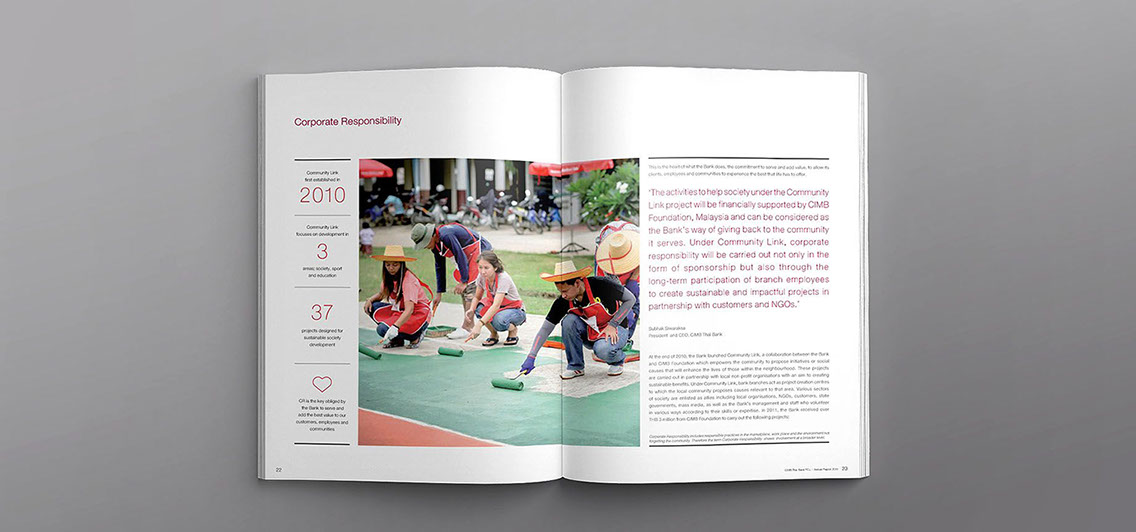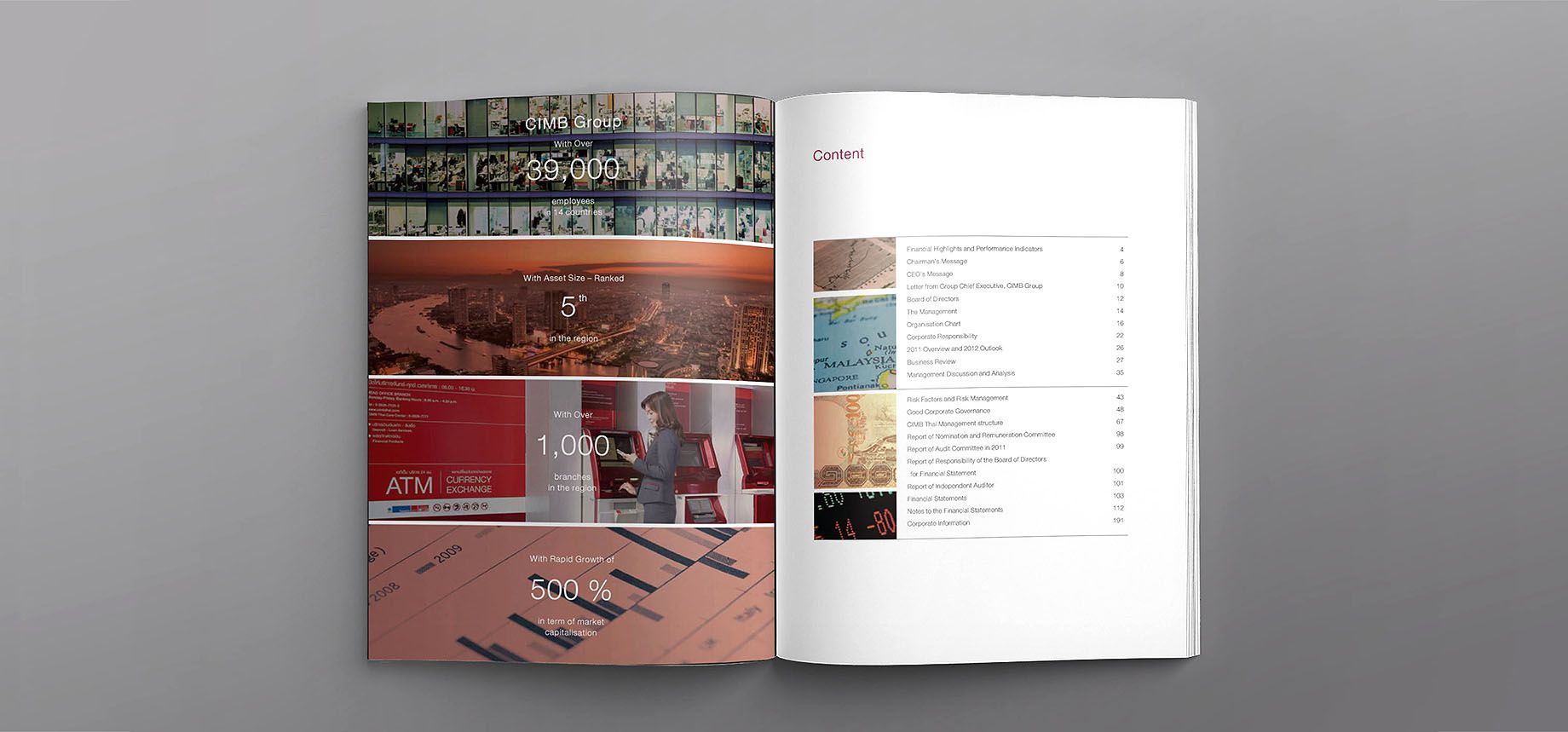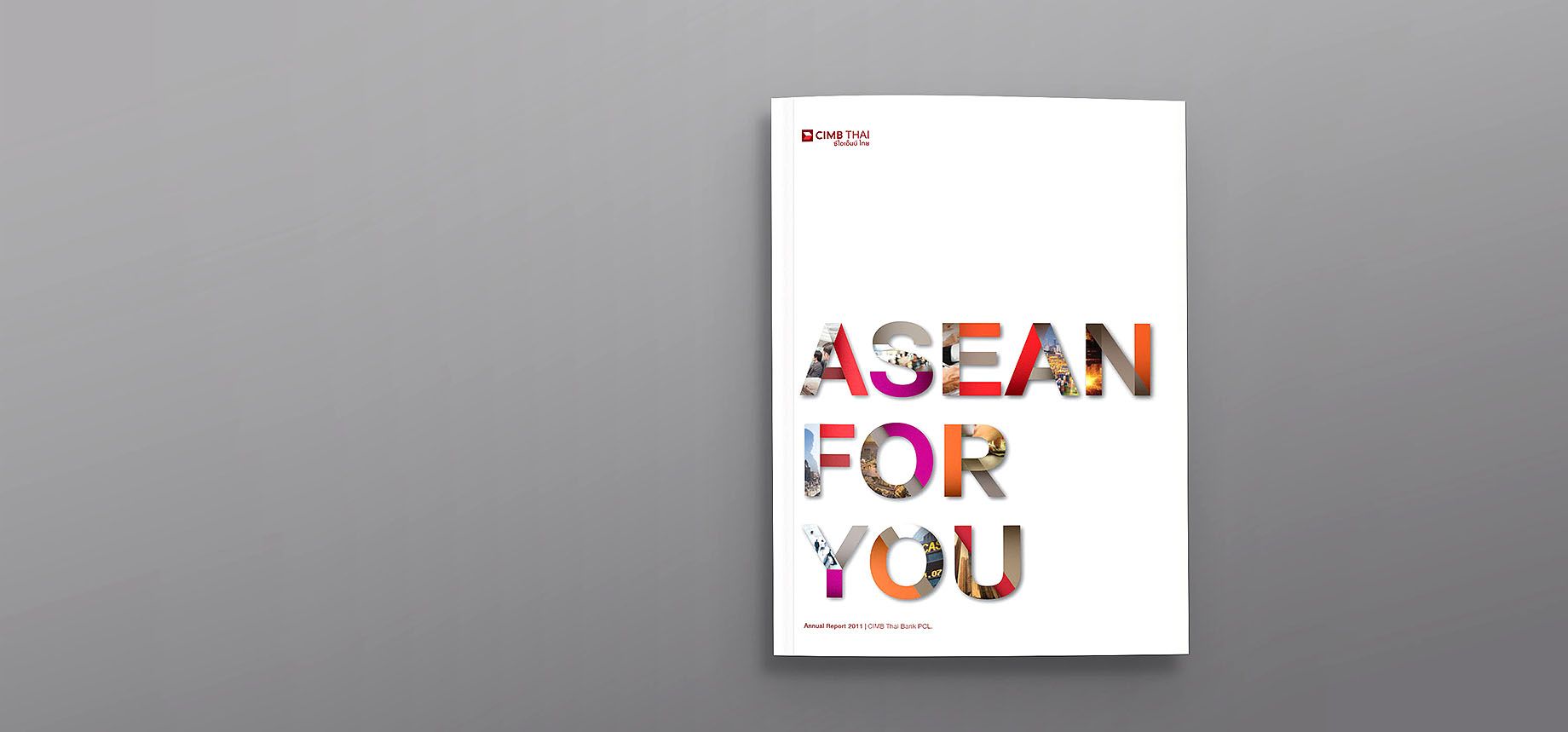CIMB Thai is a member of CIMB Group, Malaysia’s second-largest financial services provider and one of the leading banking groups in ASEAN. With over 1,000 retail branches network from all corners of ASEAN, CIMB Group offers full banking products and services to meet every need. We designed an annual report of 2011 to show their accomplishments and pledge of ASEAN power to all customers.