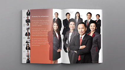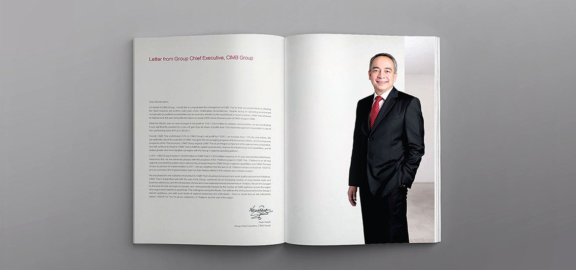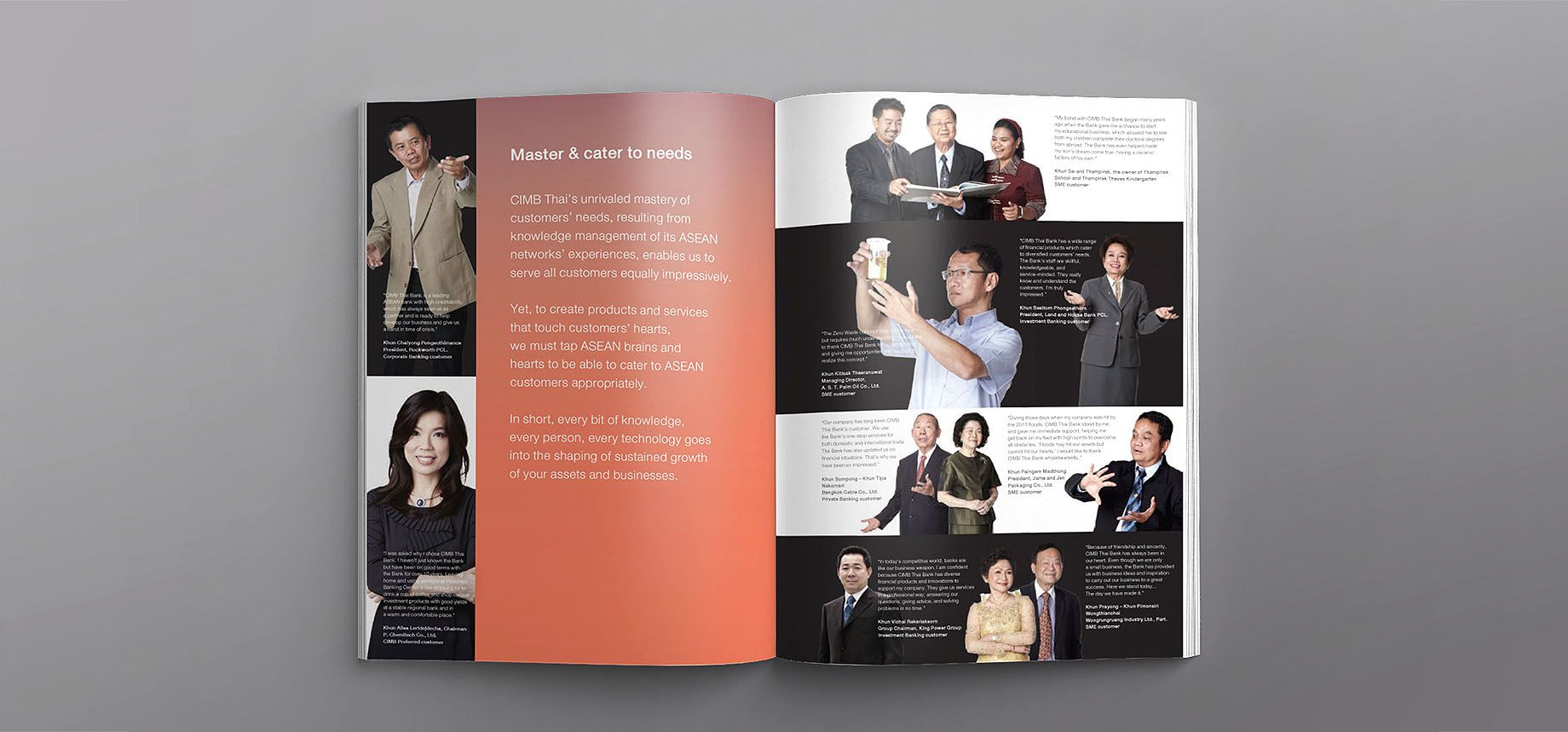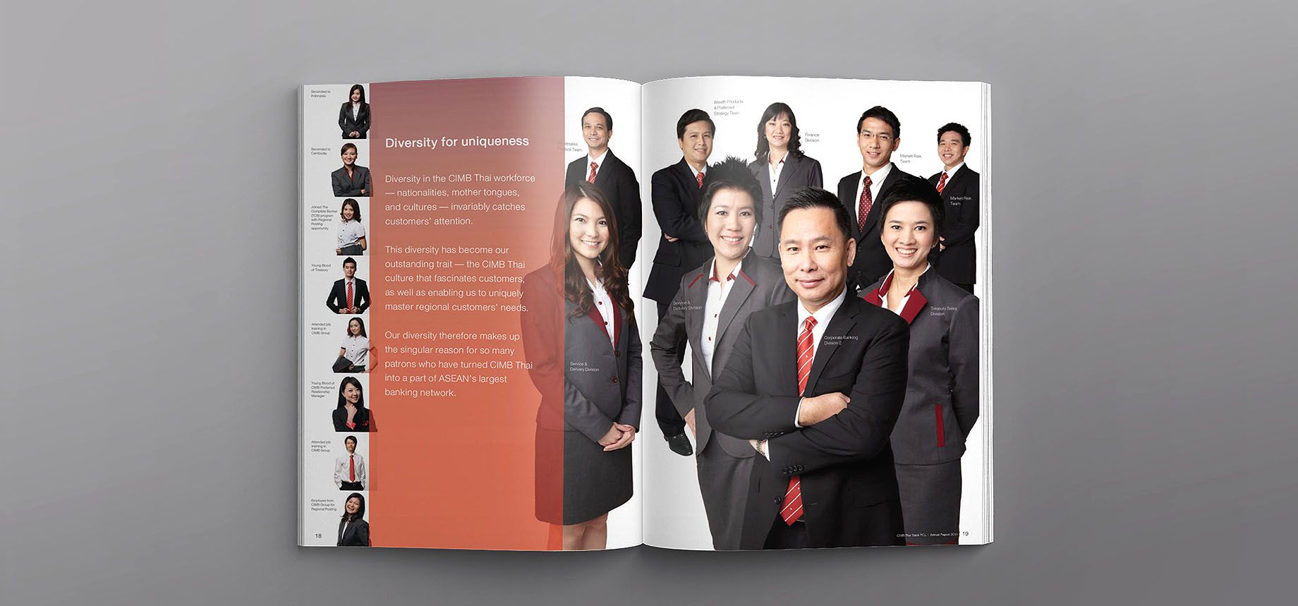 Our strategy was to reflect CIMB’s core competency, the well-equipped workforce enriched with diversity in nationalities, languages, and cultures, making the bank an unrivaled mastery of customers’ needs. The report is accompanied by portraits of CIMB Thai people, from the management level, group head division to young blood employees, shot in a professional, confident and friendly manner. We also photographed their valuable customers and asked them to share the experience of the close bond between them and CIMB Thai to add another dimension to the report. As the organization that sees their success moving forward is the one that put their customers at the heart of their business and CIMB Thai has proved to be one.