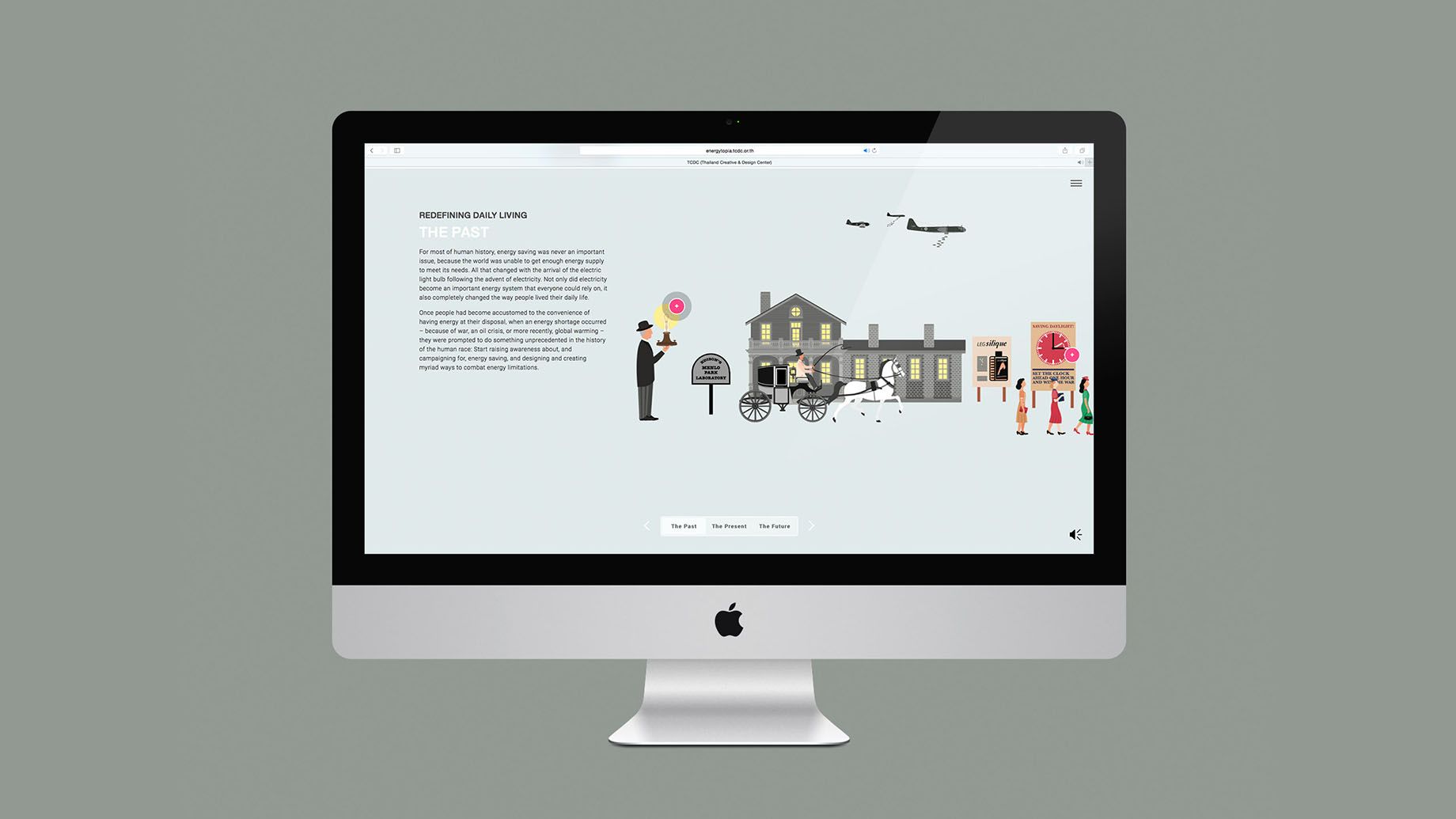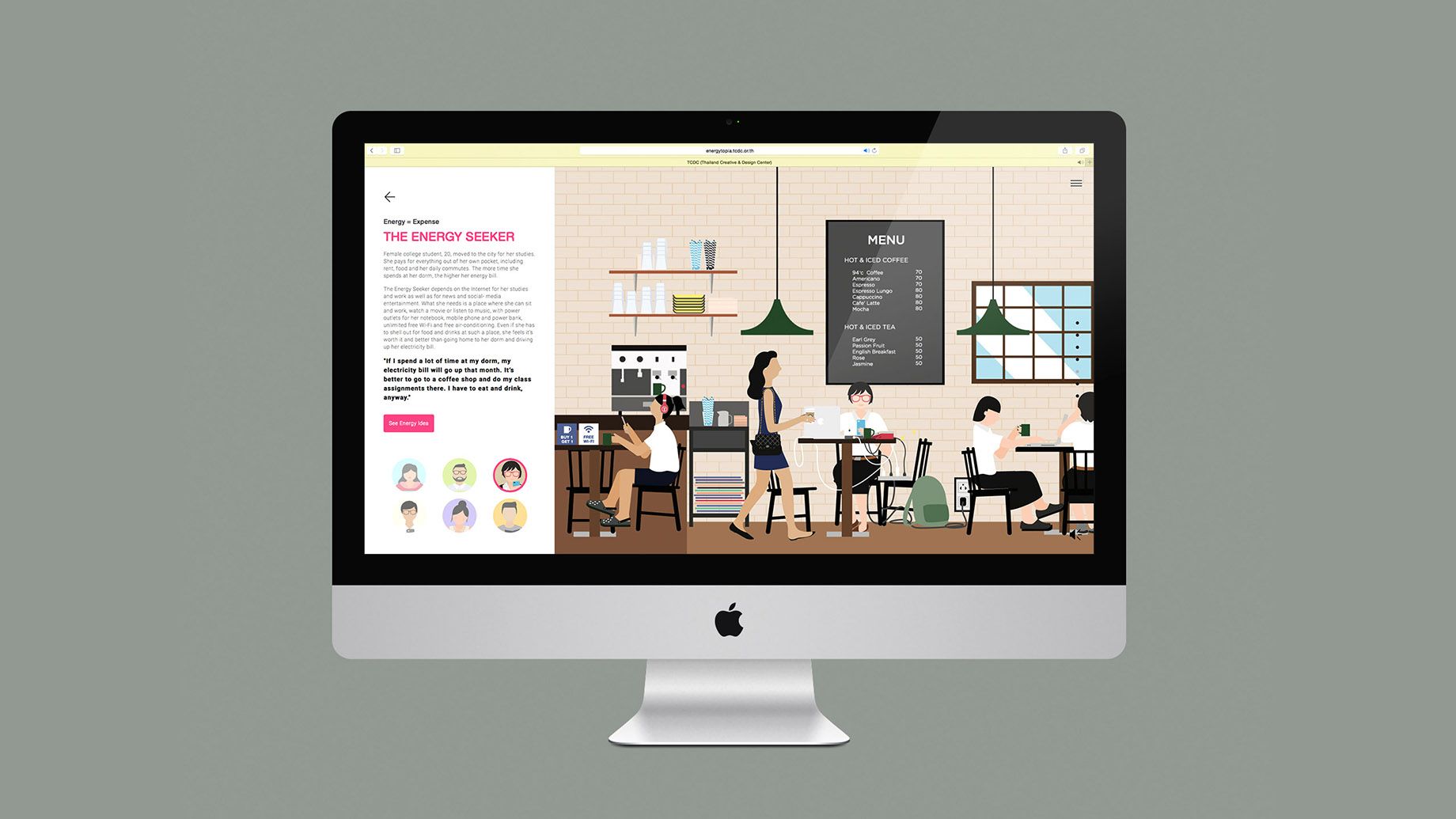 “Designing Energytopia” is Thailand Creative and Design Center (TCDC)’s first digital media learning project which aims to generate and circulate body of knowledge and understanding toward Design Thinking concept. They wanted to emphasise the ability to gain access to knowledge of TCDC regardless of time and place. This digital learning media focuses on energy efficiency in daily life using Design Thinking as a tool to shift the viewer’s paradigm of how to use energy efficiently and shed some light on new possibility of services and innovations that match their needs and lifestyles. We have designed both mobile and online exhibition to promote this project.