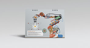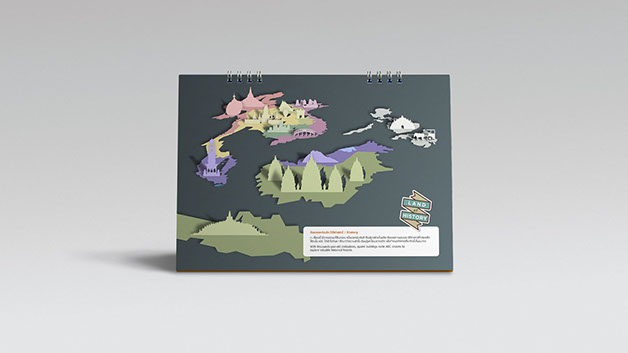 As we looked to the goal of the ASEAN Community vision, “One Vision, One Identity, One Community”, we chose to depict the subject in a slightly unconventional way. Our idea was to allow the spirit of this community to take center stage and enhance the opportunity arisen from this unity to shine. We created 12 illustrations to celebrate the strength of the regional integration in different aspects–visualizing the theme of each ranging from art, culture, economy, and geography, such as prosperity of natural resources, exquisite cuisines, world-renowned tourist destinations or joyful cultural festivals and ceremonies. Each illustration derived from each iconic attribute of AEC member countries to form a big picture. We employed diverse illustration techniques from collage, paper sculpture to vector illustration. Inspired by the theme journey, we designed a special icon for each page to mark as a passport stamp, while the cover resembles a well-traveled leather suitcase covered with travel stickers and luggage tags. The calendar is a unique visual narrative and pleasant journey to AEC.