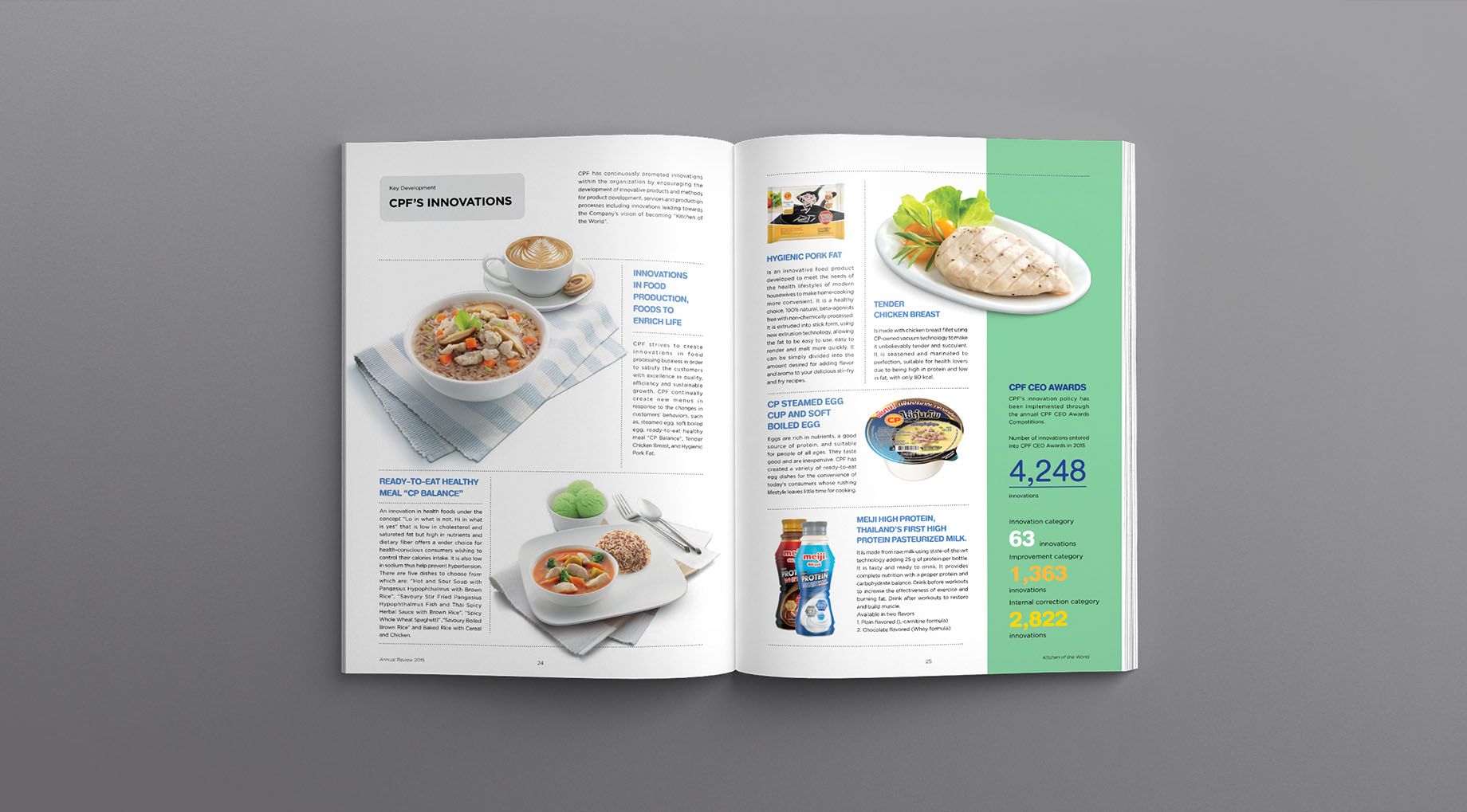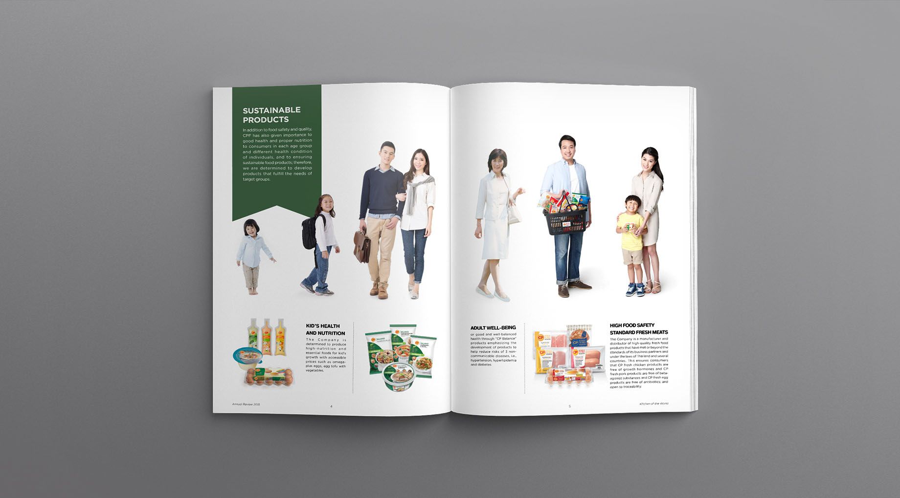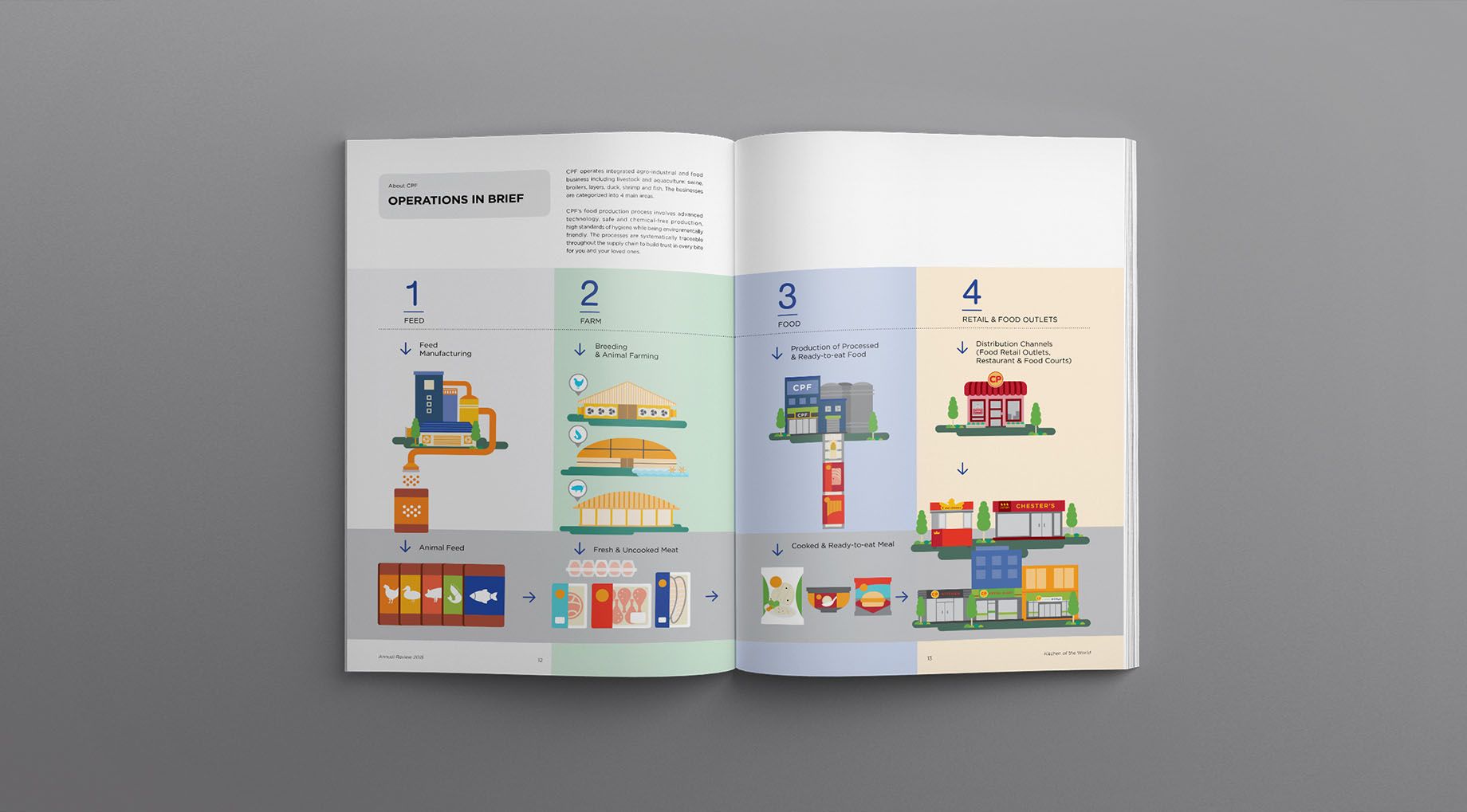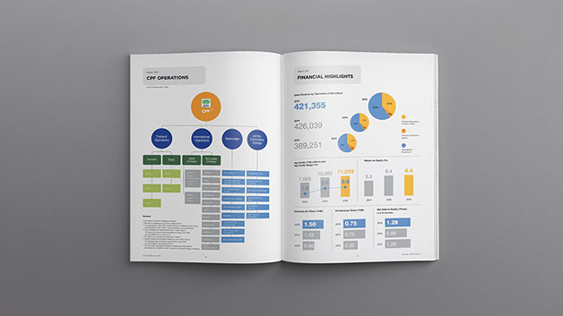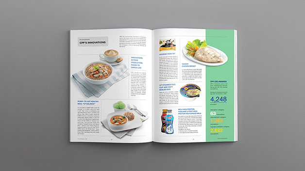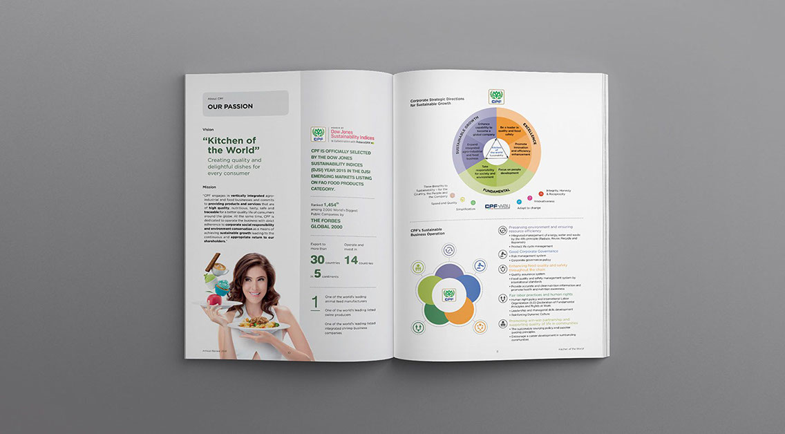 Our strategy was to turn solemnly dry reports into a visually appealing, memorable and yet well-informed design project. We restructured the report and reorganized the set of information based on the idea of magazine design. Short and concise data are mixed with warm photographs and lively graphic expression. The cover illustrates CPF’s integrated businesses from animal feeding, farming, and processing to ready meal products including their food retailers. The result is a report that reflects CPF’s operations and philosophy as well as please the eyes for everyone.