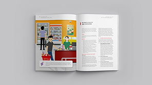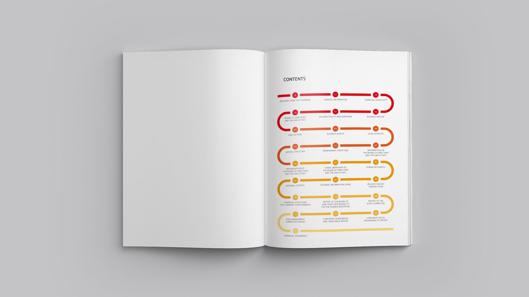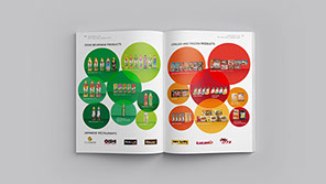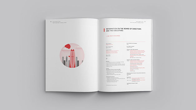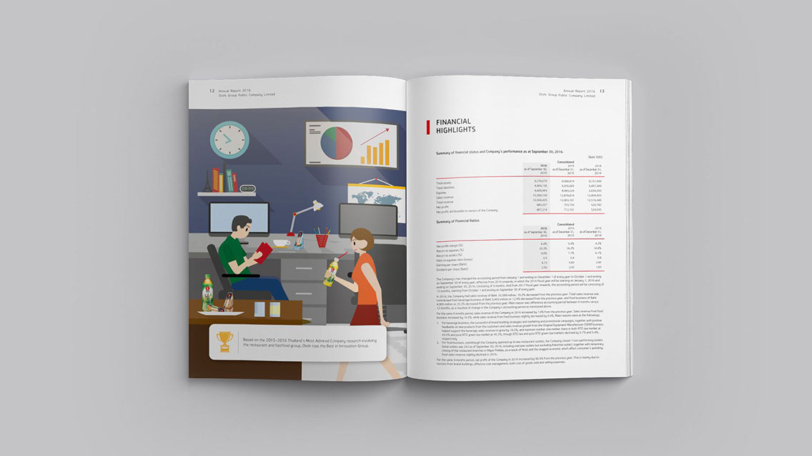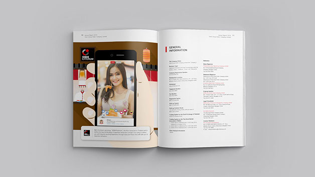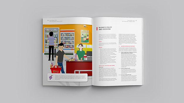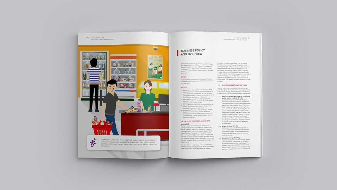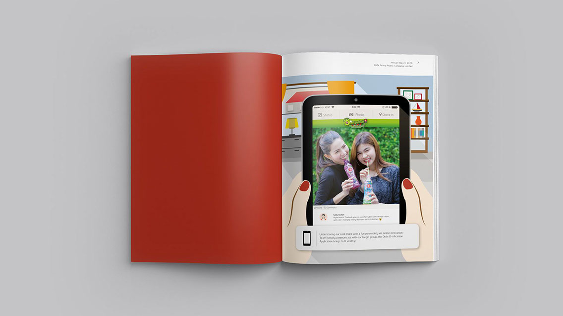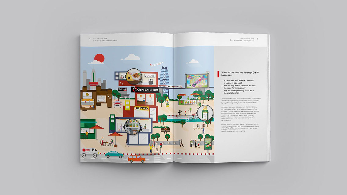 The theme of the Annual Report was Oishi 4.0, in response to Thailand 4.0, Thailand’s new economic model aimed to transform the country into an innovation-driven one. We engaged the new age readers through the use of vivid illustrations portraying lifestyles on the relation between people, technology and Oishi Group products. Inspired by the impact of social media in everyday life, we provided visual stories about how Oishi Group penetrate to their customers at any time, place or occasion by way of high-tech applications to draw customers with similar tastes as well as customize cuisine according to everyone’s taste. The incorporated graphics constructed from simple geometric shapes help make the report consistent with the vibrant and digital tone, complemented by circle shape and colour red from Oishi Group’s corporate identity.
