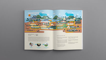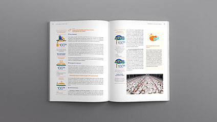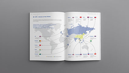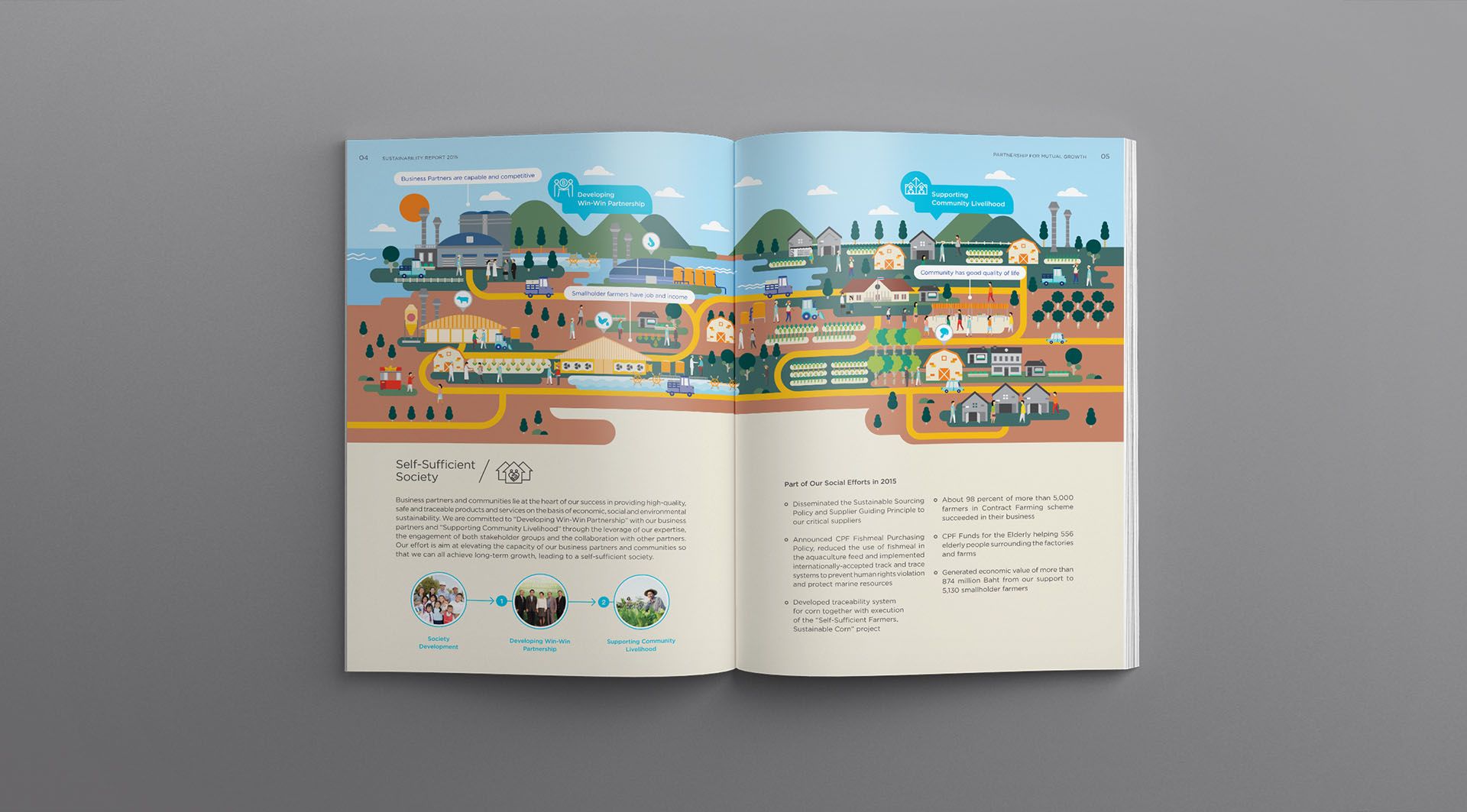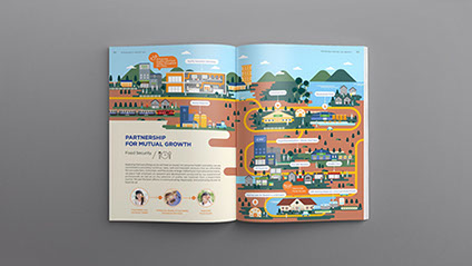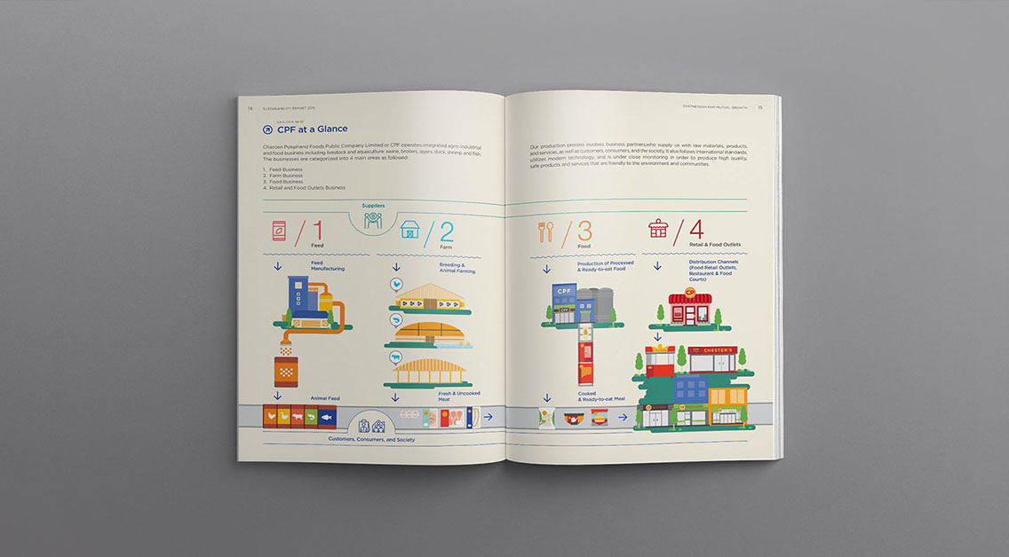 Our goal was to project the whole pathway of CPF’s operations to sustainability from beginning to end: production of animal feed, breeding and animal farming, production of processed and ready-to-eat food to food retail outlets and restaurants. Every detail of illustration reflects CPF’s commitment and dedication to community, society, and environment. The long chain of information and jargon was made less complex and accessible by bright and warm coloured illustration which has been carefully crafted for clear understanding.