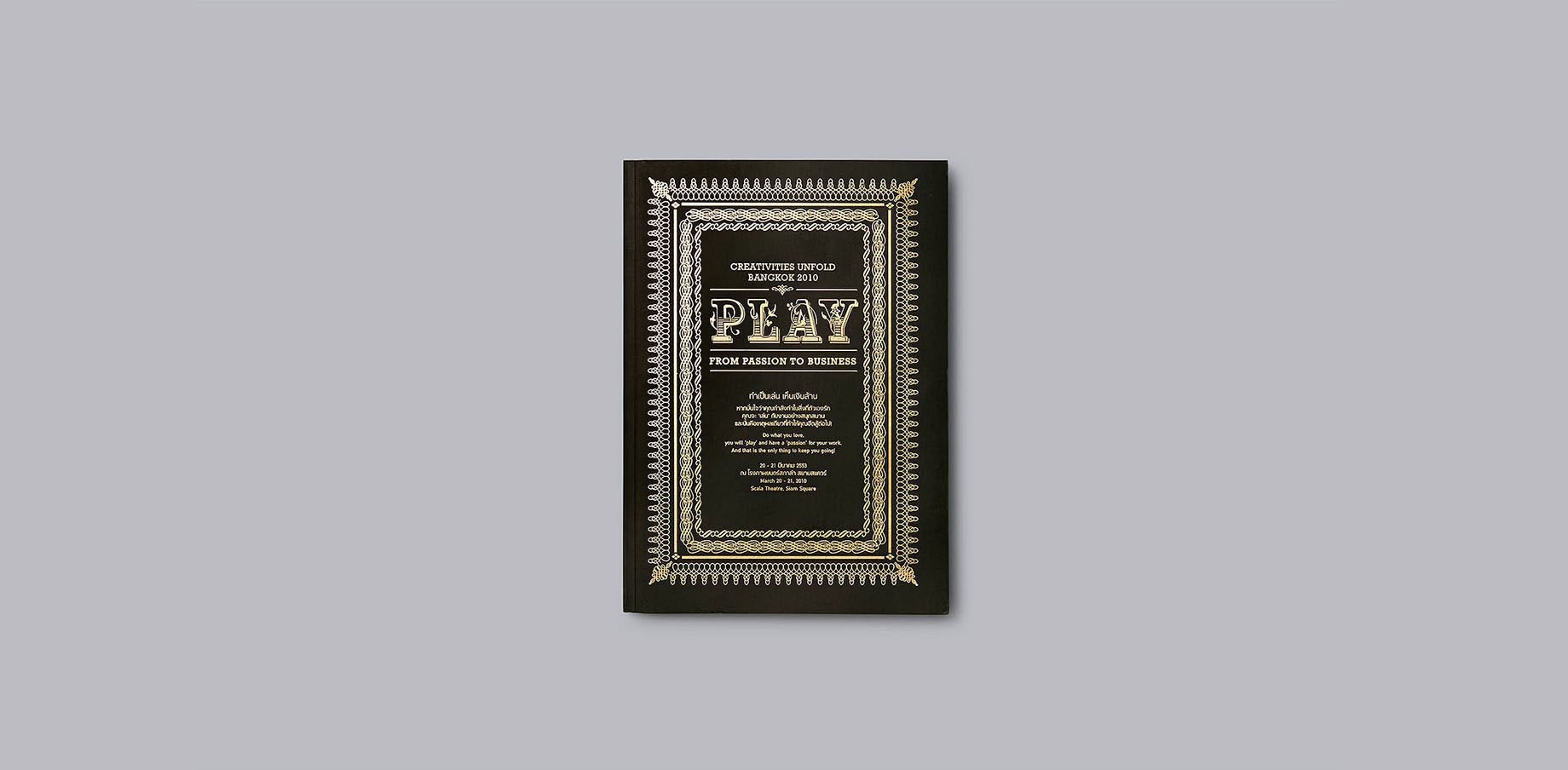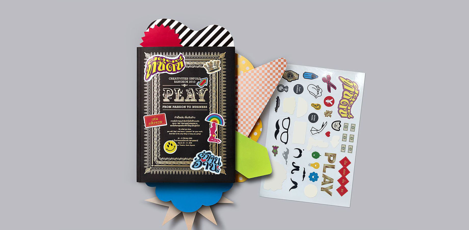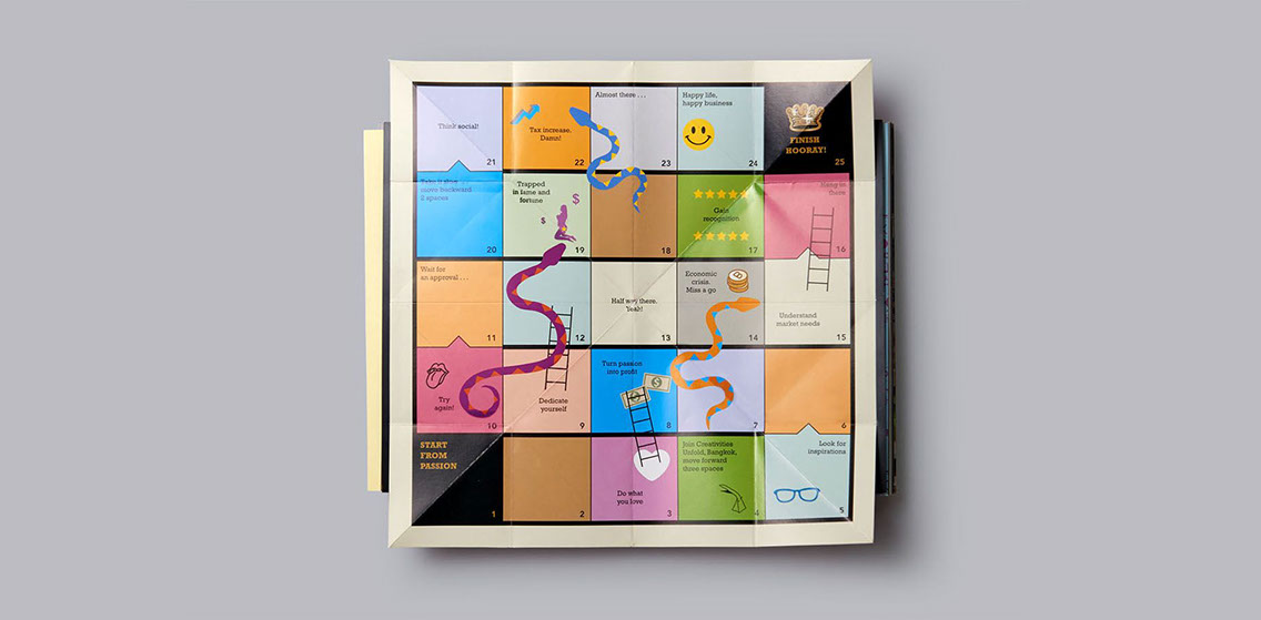 In 2010, Thailand Creative & Design Center (TCDC) organized the annual symposium Creativities Unfold, under the title “Play: From Passion to Business”. The event explored how successful entrepreneurs from various professions across the world turned their passion into profit. Our job was to design a book to accompany the event and bring all speakers’ inspiring stories to life.