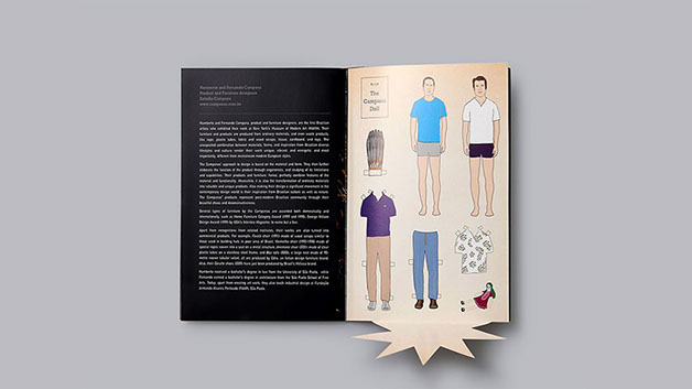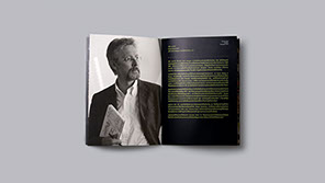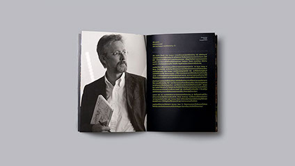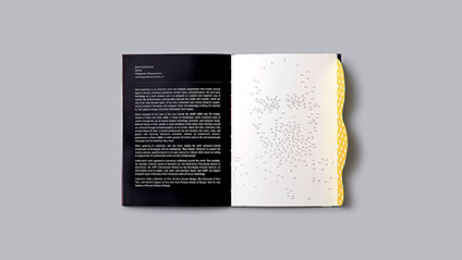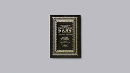 Working around the concept of work and play, our strategy was to imply the inseparable dimension of working in play and playing at work. The playful interaction echoed continuously throughout the catalog in relation to the contents. Using games, pop-up, 3D glass and flaps to reflect the works of each speaker, our goal was to enhance the big idea. For the cover, we used heavy type ornament with gold embossing, while inside provided a sticker sheet to break the formal tone of the outside.