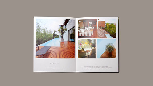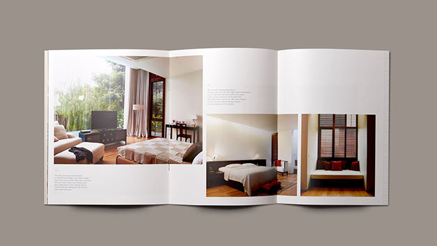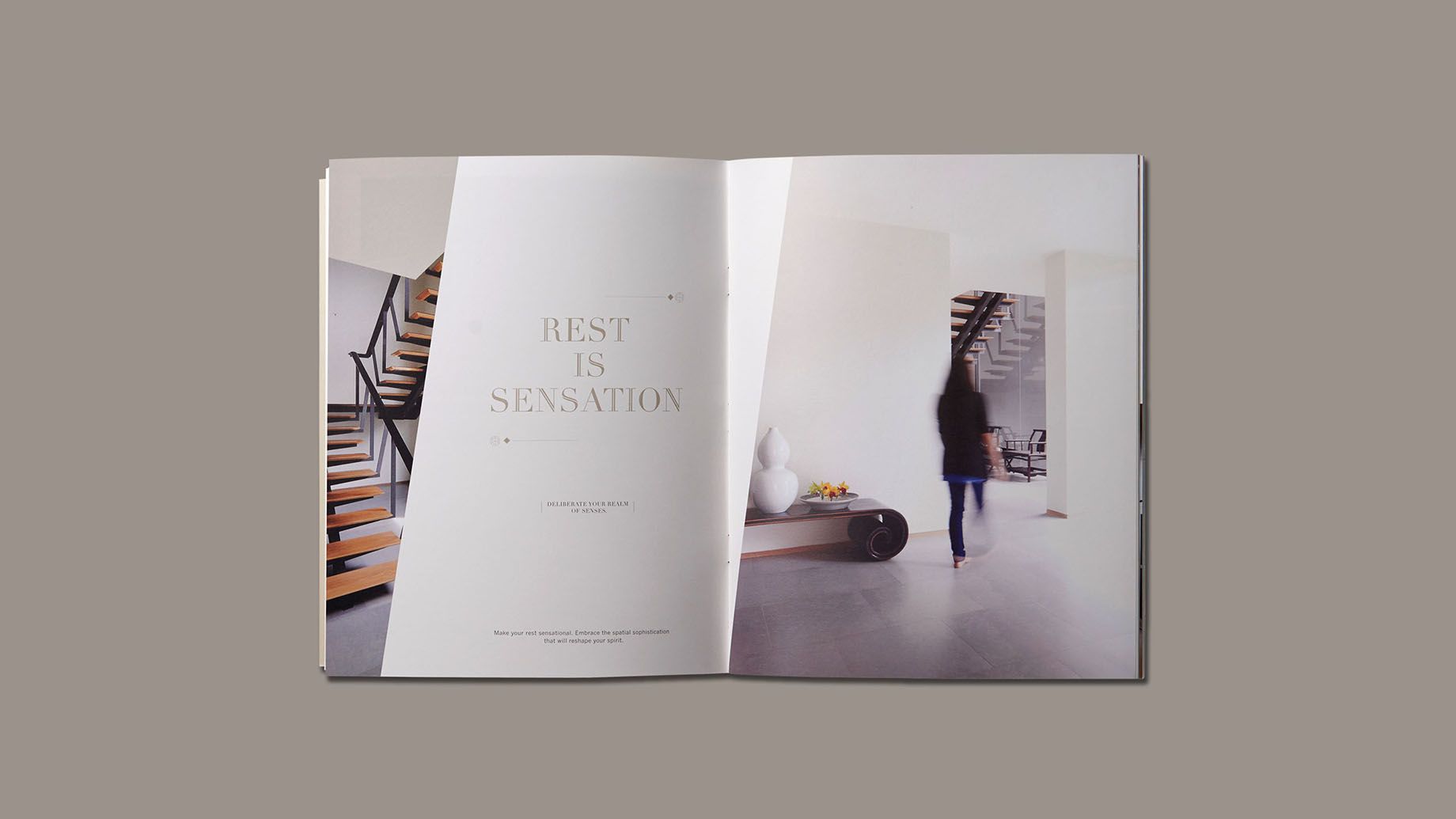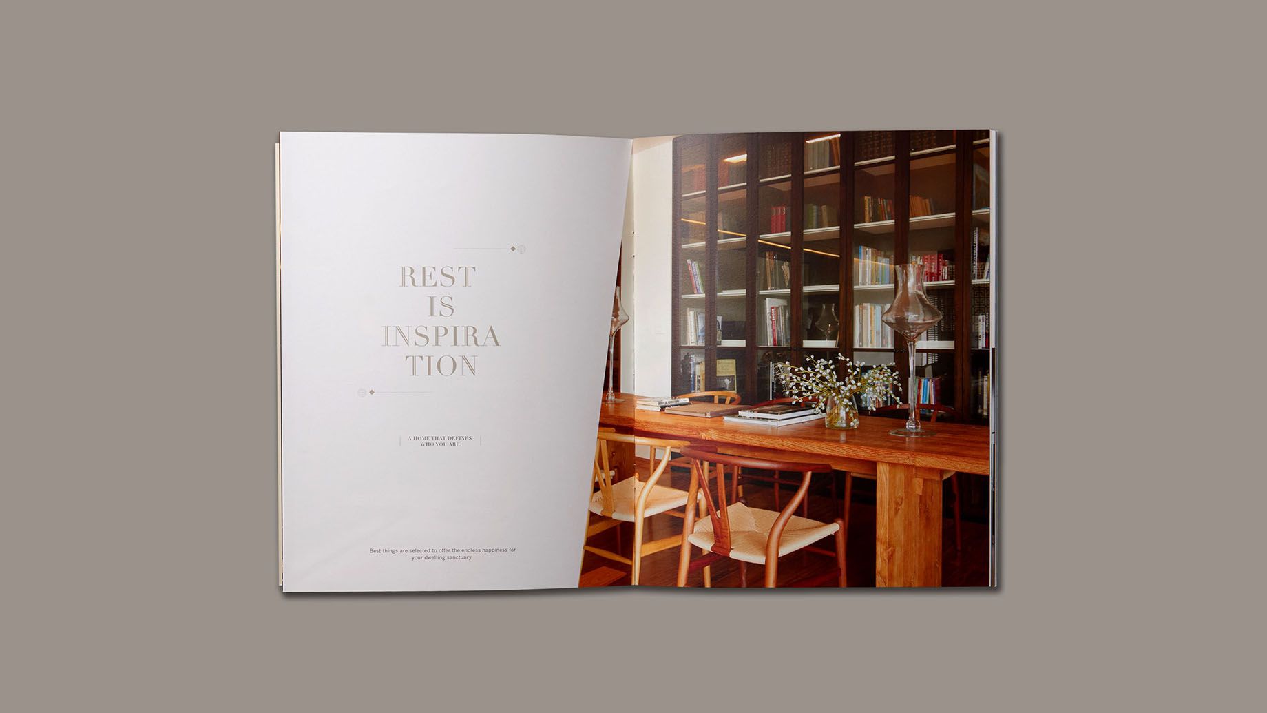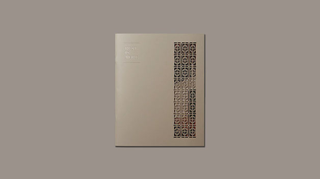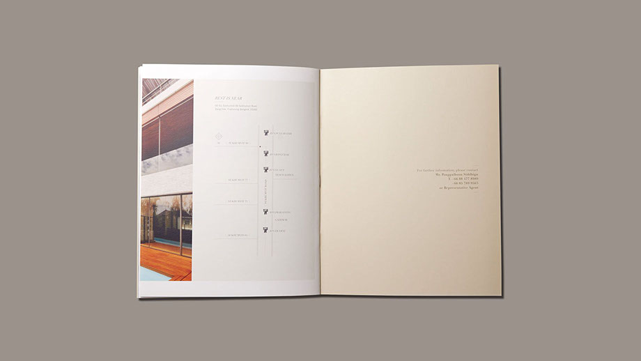 Rest is More is a custom sale kit designed to showcase an 800 sqm residence, built on the principle of relaxation in the Sukhumvit area. We designed a sale book that was striking in its calm, stylish tranquility to reflect the concept of the house including its interior design and amenities where the residents’ quality of life is the priority. The booklet entices its prospective buyers with peerless design and function of the house, utterly conducive to relaxation in every moment and corners, through the use of featured full-colour photographs. Inspired by a unique detail of the Chinese wood lattice panel, we formed a distinct personality of typography and graphic element to complete clean and minimal layouts. Printing and production techniques help make the sale kit feel special on the final touch with gatefold and die-cut cover, subtle gold colour, and quality paper stock.