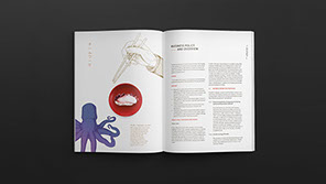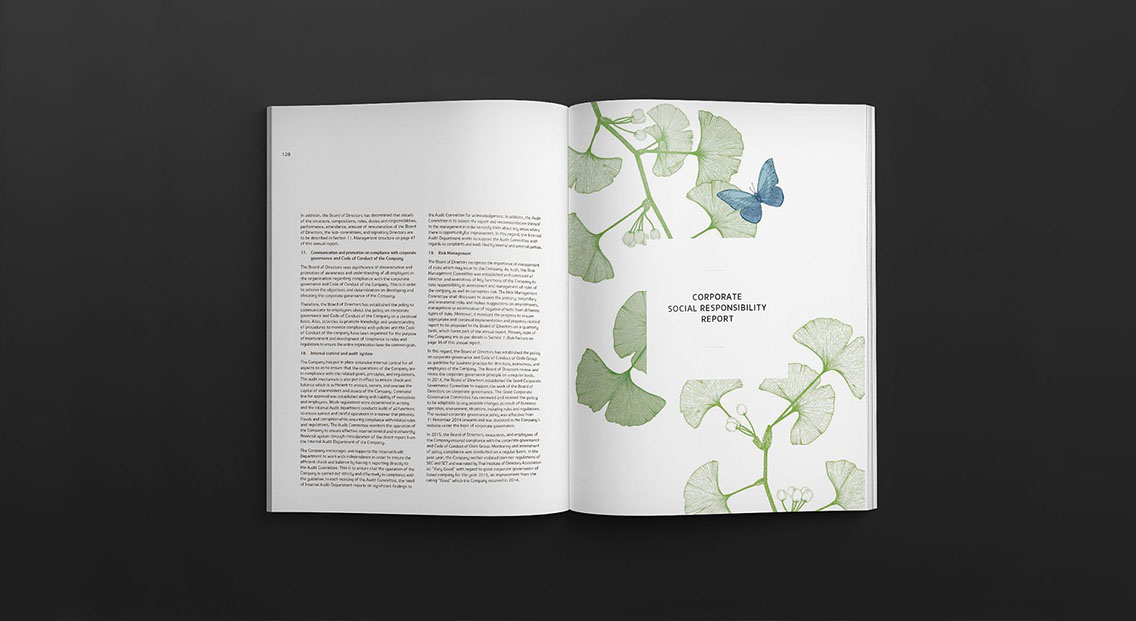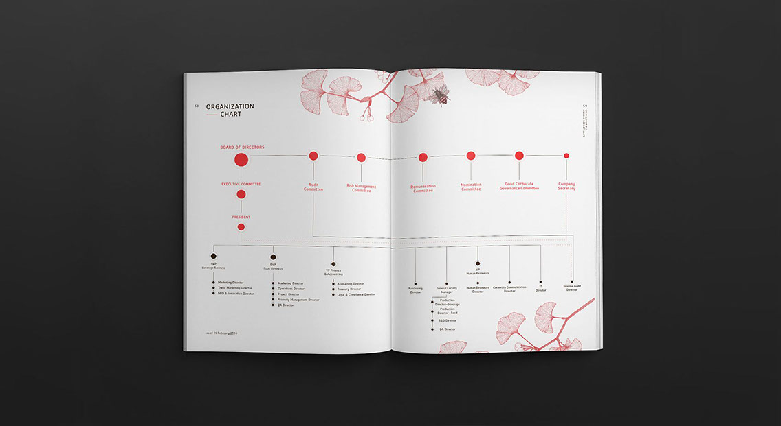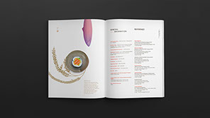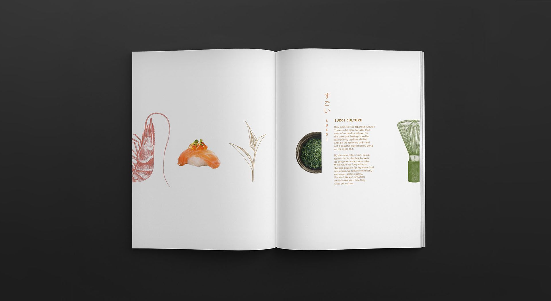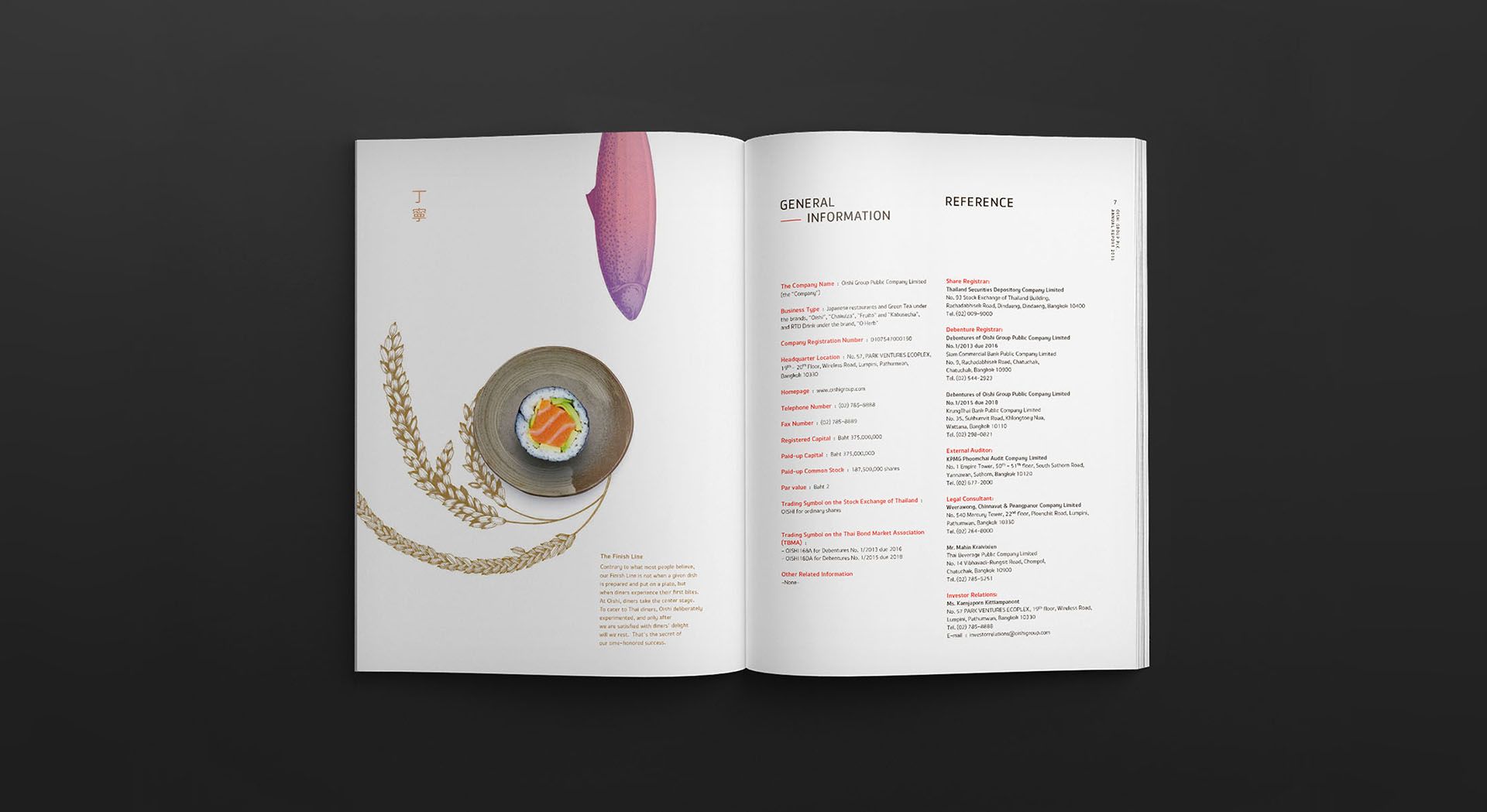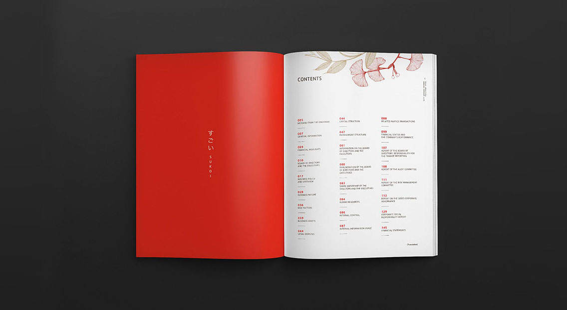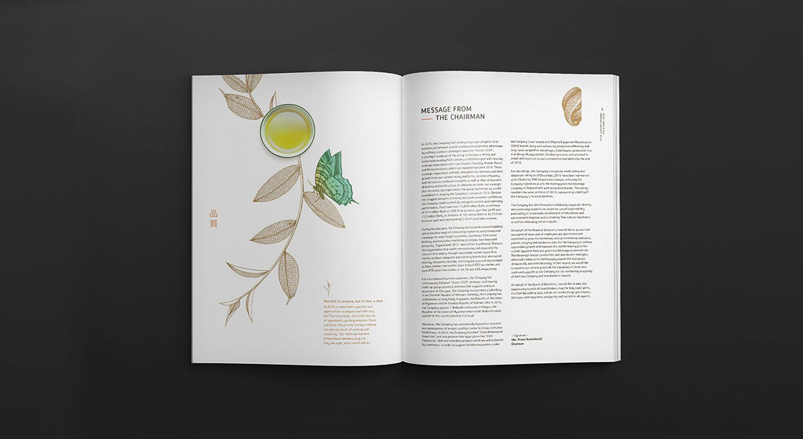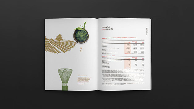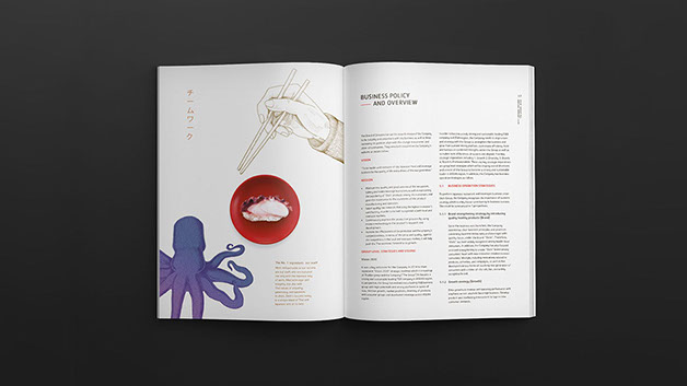 Sukoi! is a Japanese expression, generally meaning ‘great’, amazing’ or ‘to a great extent’, which resembles the core value of Oishi Group in remaining relentlessly meticulous about quality. Our goal was to reflect how Oishi Group embraced the Japanese DNA in their way of working, from sourcing prime ingredients, cooking and seasoning to production, to yield an exquisite flavor and feel sukoi in every taste. Associating illustrations with photographs, we placed an emphasis on visual narrative of the most popular Oishi Group products, Japanese cuisine and green tea, and their finest sources. The white space plays a vital role to distill calmness, simplicity with zen principle in mind, echoing the delicate and artful touch of Oishi delicacies. The report is illustrated with images from nature throughout the book which enhances the flow of information with moments of peace.