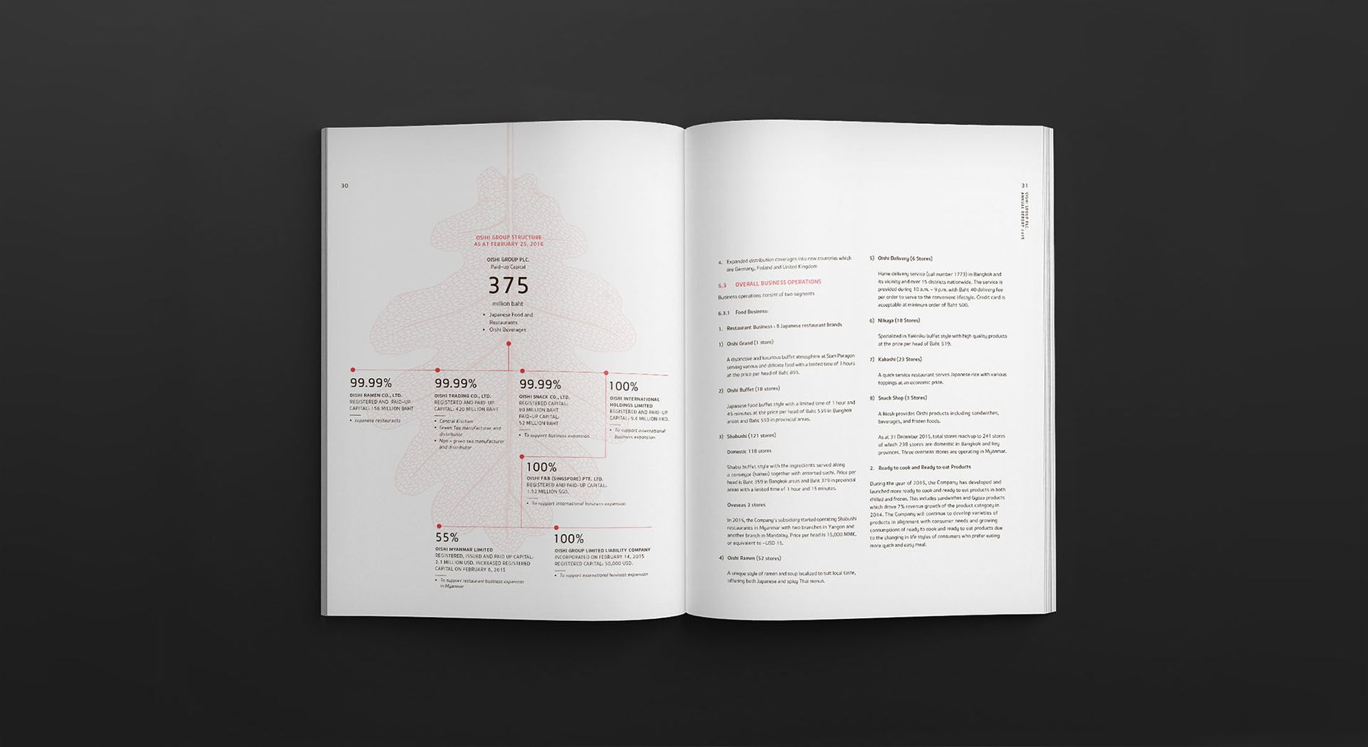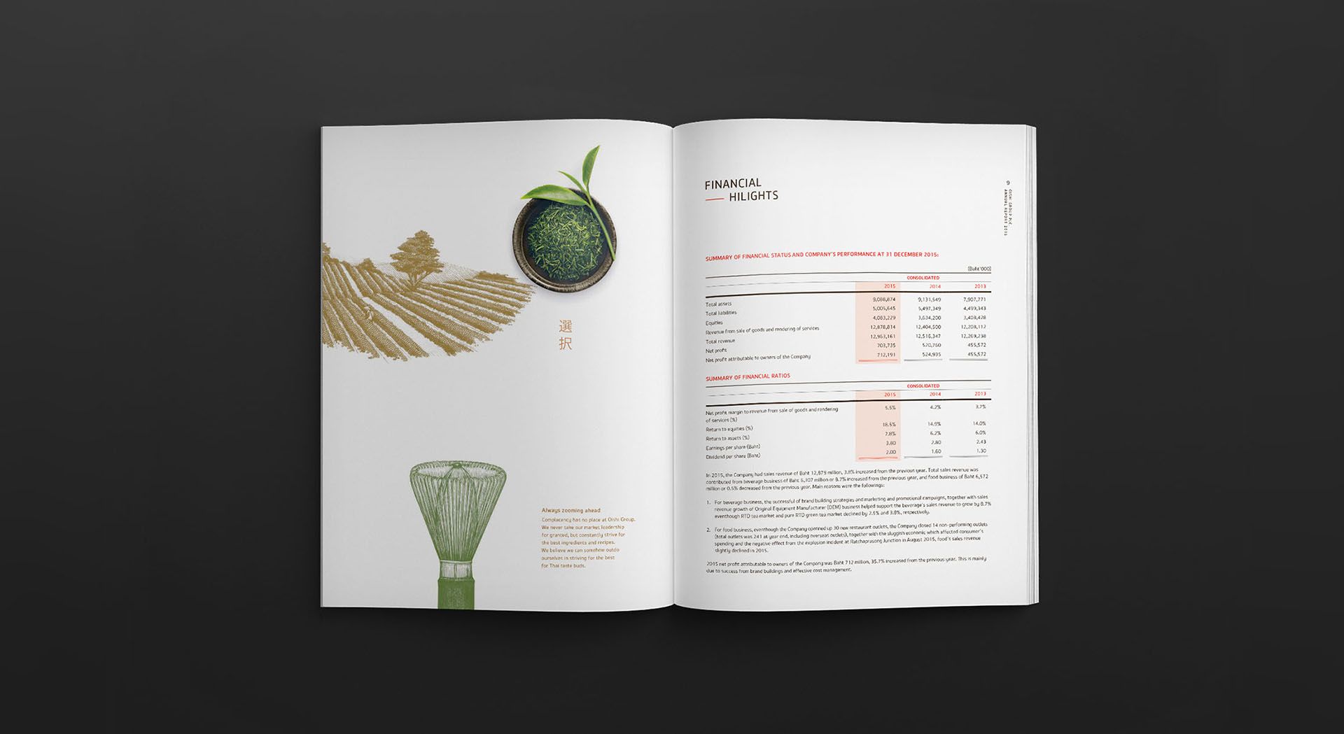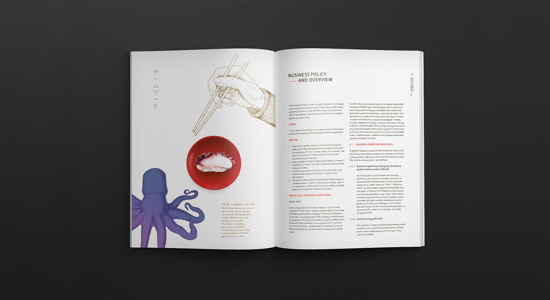 Oishi Group is one of the top food and beverage companies in Thailand with the highest rank in the pole position for Japanese food and green tea drinks. We supported Oishi Group in their enduring achievement to design an Annual Report 2015 based on the theme “Sukoi!”.