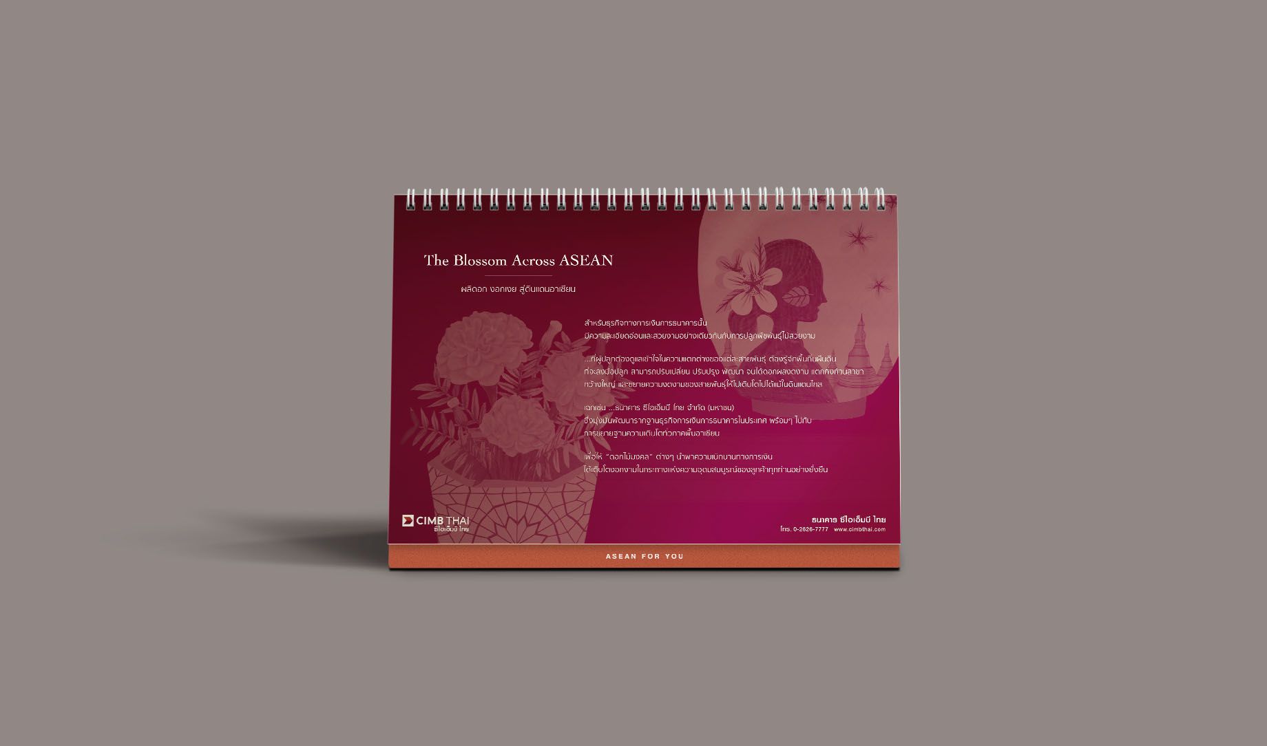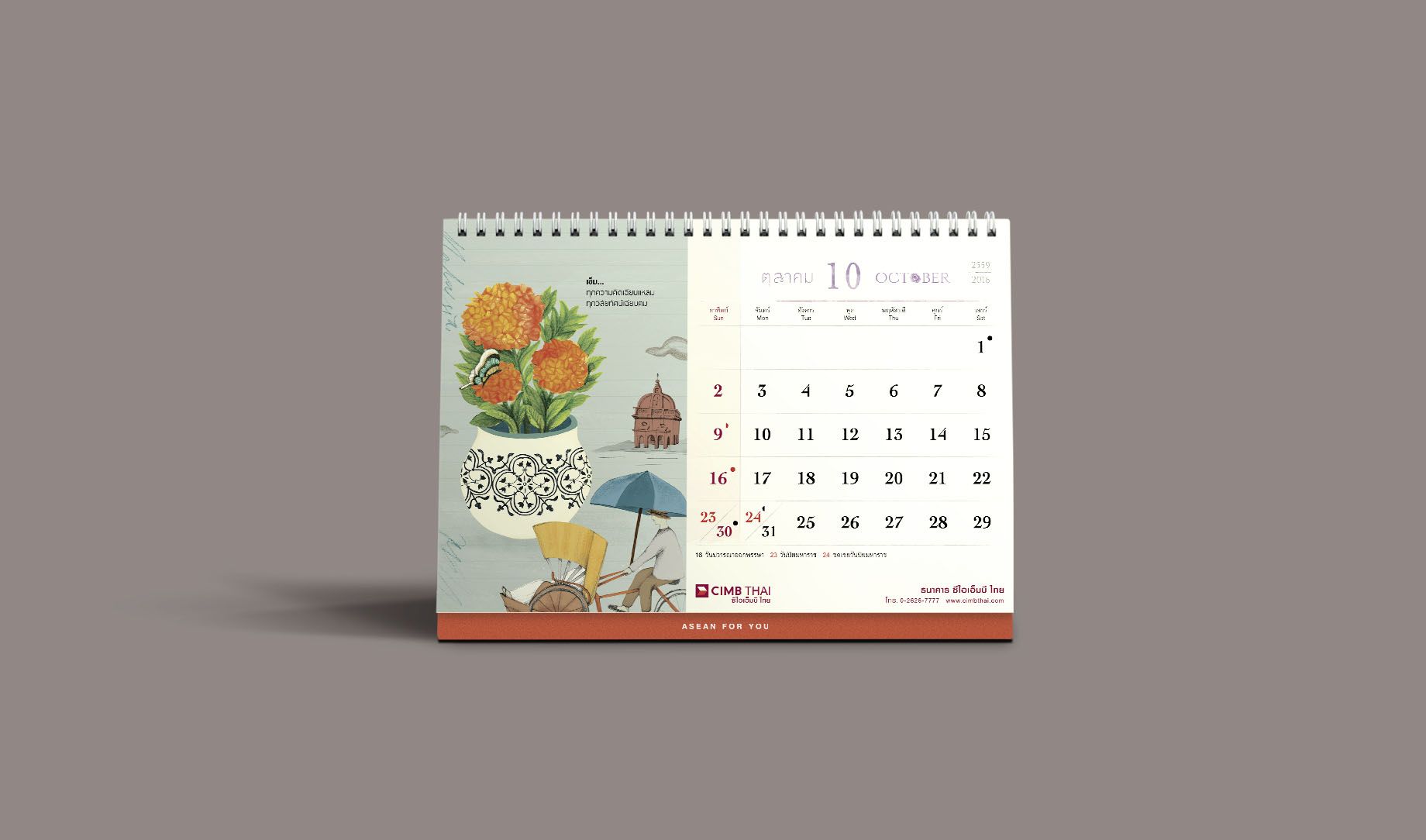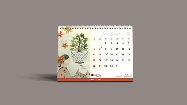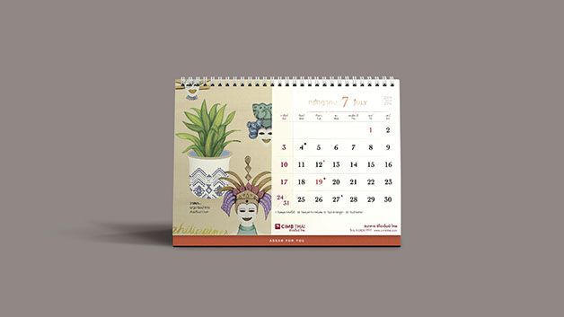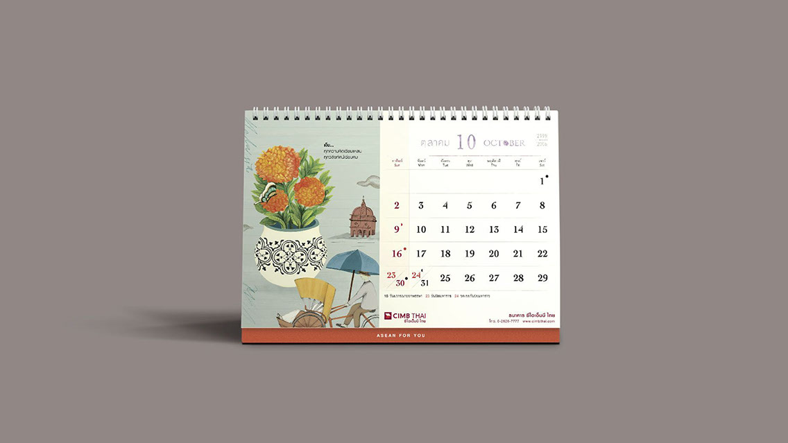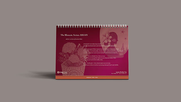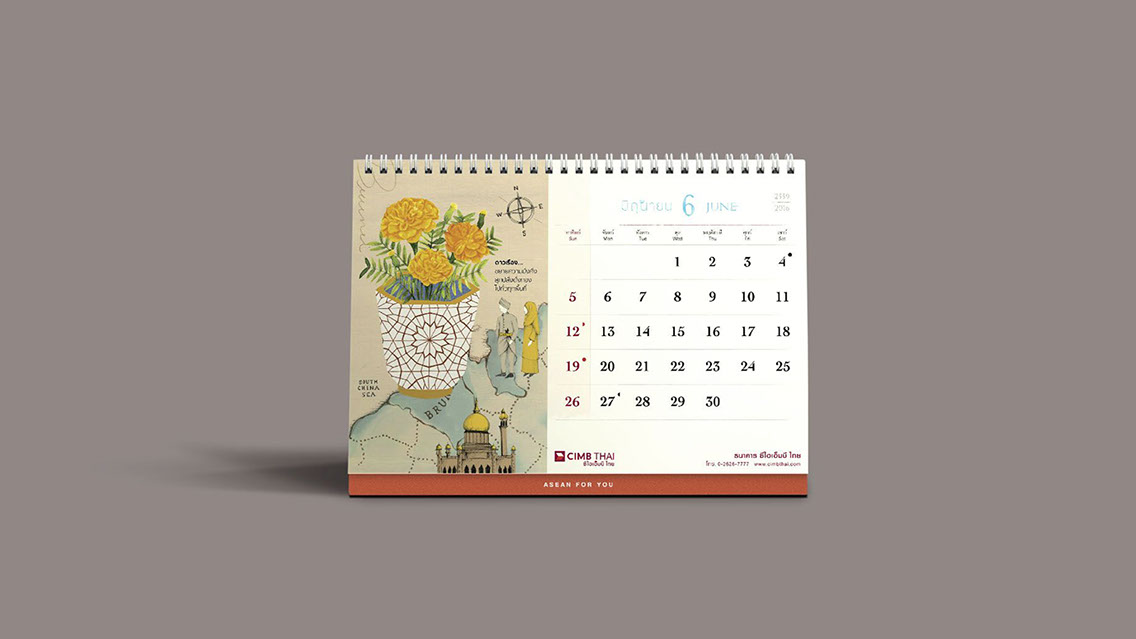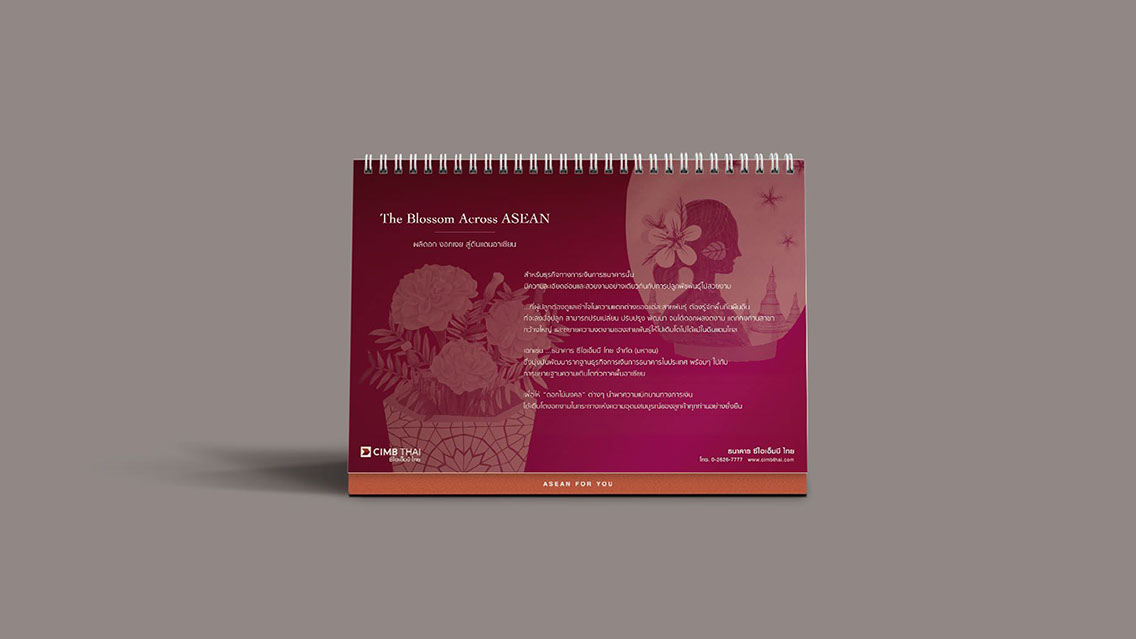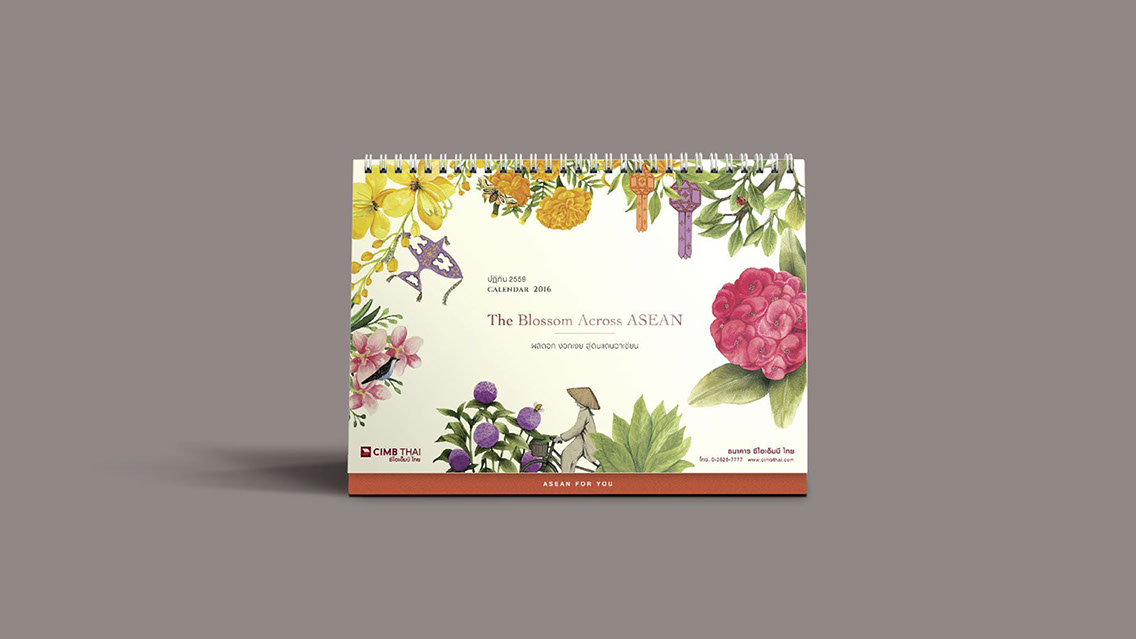 To succeed in banking and financial business, it needs tremendous care and attention to detail, similar to the foundation of planting. The practice of cultivating plants involves the best understanding in different types of plants, the land and its kind of soil, how to improve and amend your soil to branch out and yield fruitful success. We paired up these two stories of cultivation and came up with a visually pleasing calendar design. The calendar features hand-painted illustrations of Thai sacred plants in each month representing the Bank customers that beautifully flourish in different land, whereas the surface pattern and colour of the vase is inspired by traditional local arts used in everyday objects such as the pattern of ceramic floor tiles in Melaka or Vietnamese porcelain cup. The illustration introduces the unique features of each ASEAN country, national costume, arts, crafts and landmarks to imply that CIMB Thai know ASEAN best.