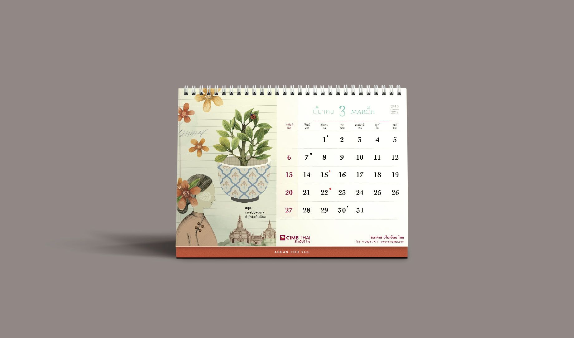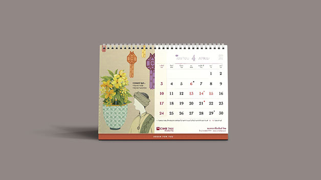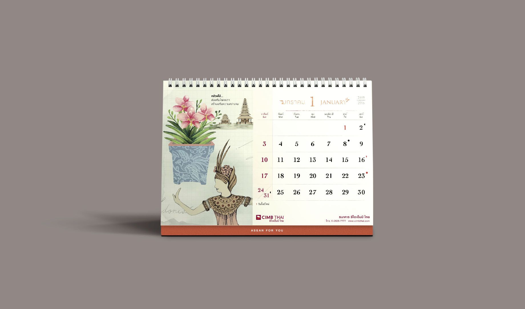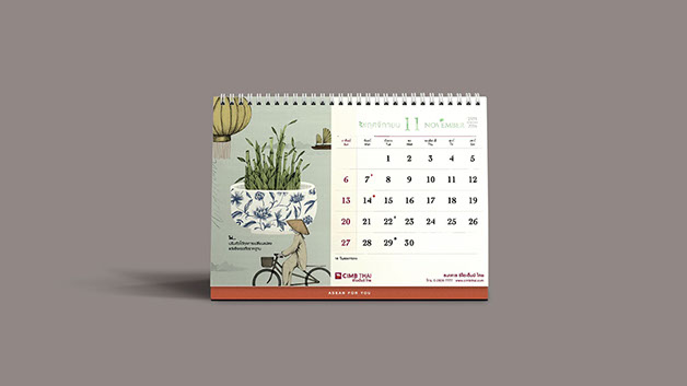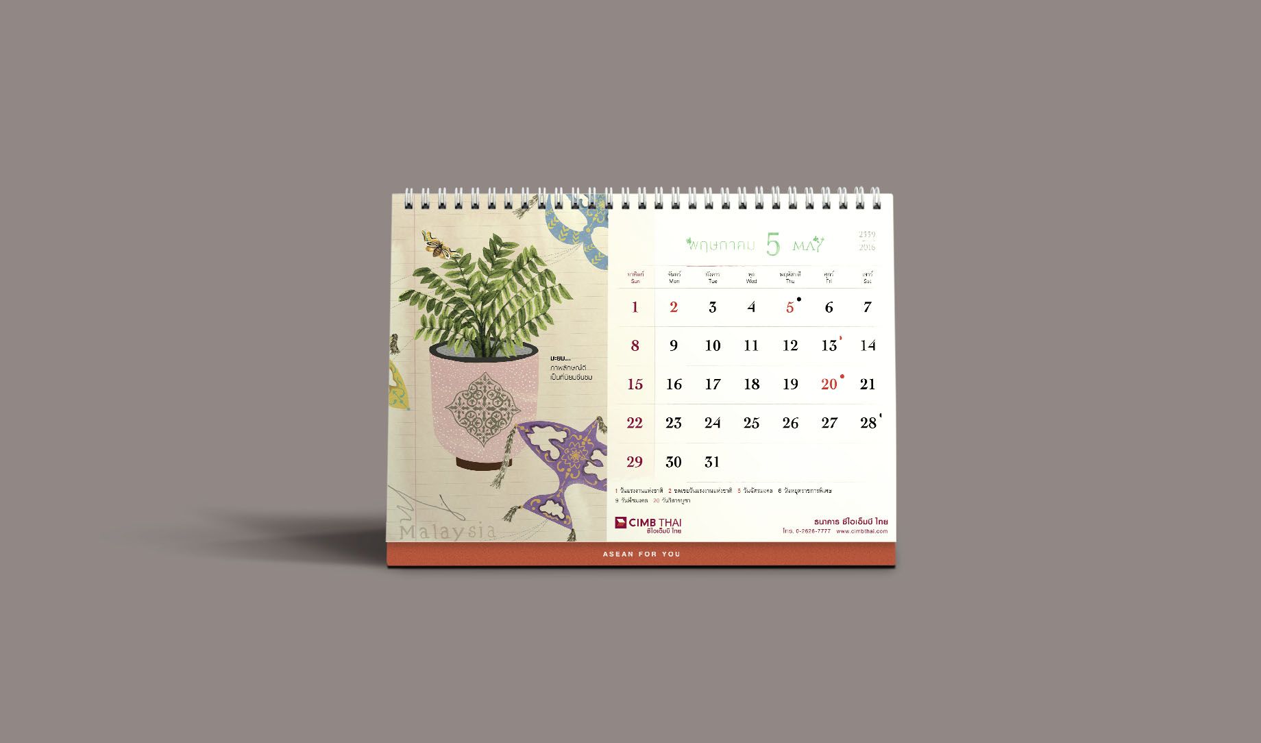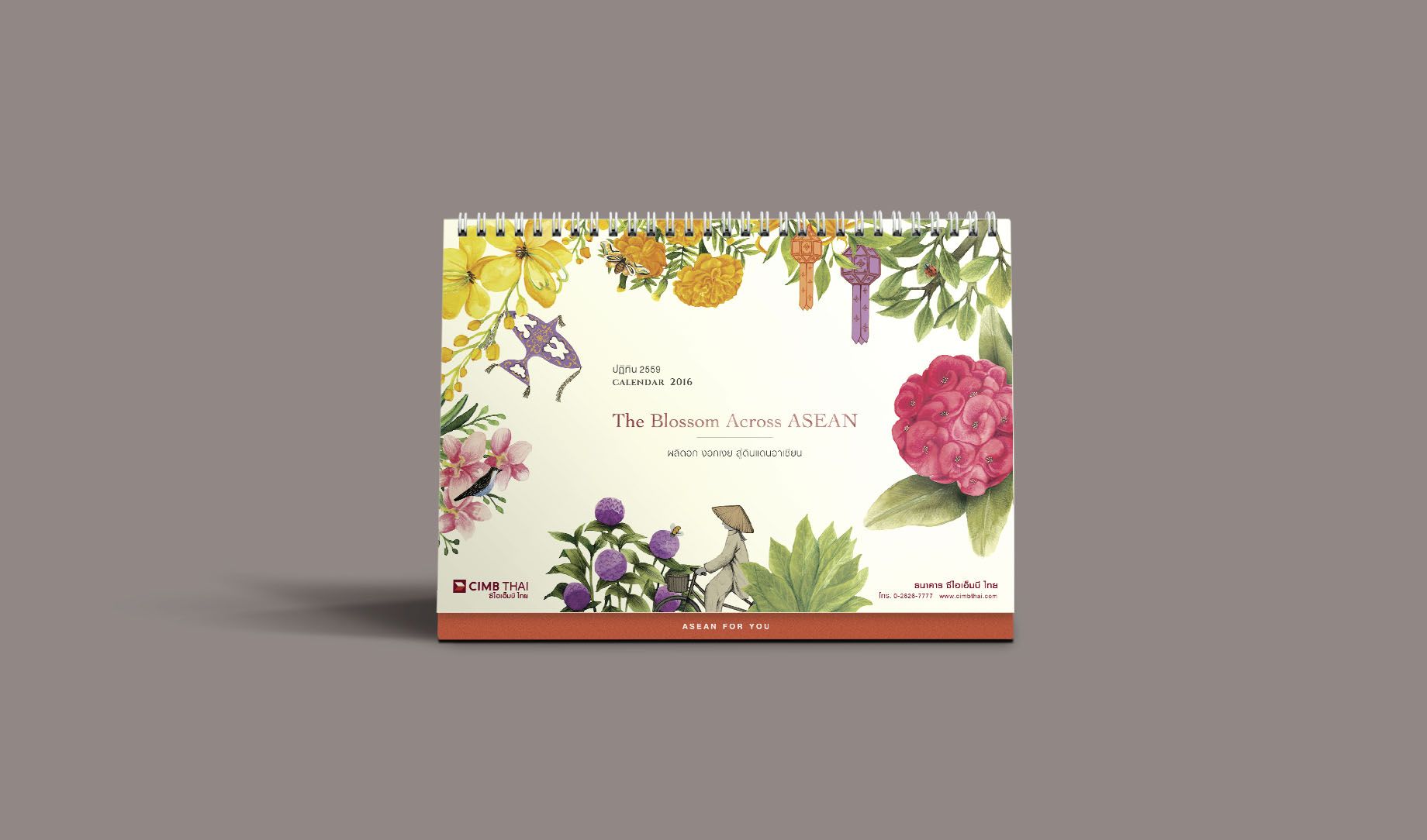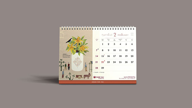 To succeed in banking and financial business, it needs tremendous care and attention to detail, similar to the foundation of planting. The practice of cultivating plants involves the best understanding in different types of plants, the land and its kind of soil, how to improve and amend your soil to branch out and yield fruitful success. We paired up these two stories of cultivation and came up with a visually pleasing calendar design. The calendar features hand-painted illustrations of Thai sacred plants in each month representing the Bank customers that beautifully flourish in different land, whereas the surface pattern and colour of the vase is inspired by traditional local arts used in everyday objects such as the pattern of ceramic floor tiles in Melaka or Vietnamese porcelain cup. The illustration introduces the unique features of each ASEAN country, national costume, arts, crafts and landmarks to imply that CIMB Thai know ASEAN best.