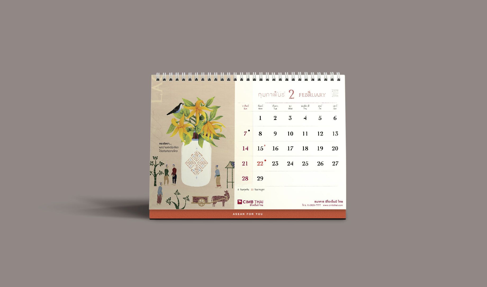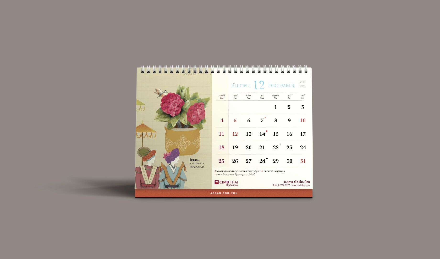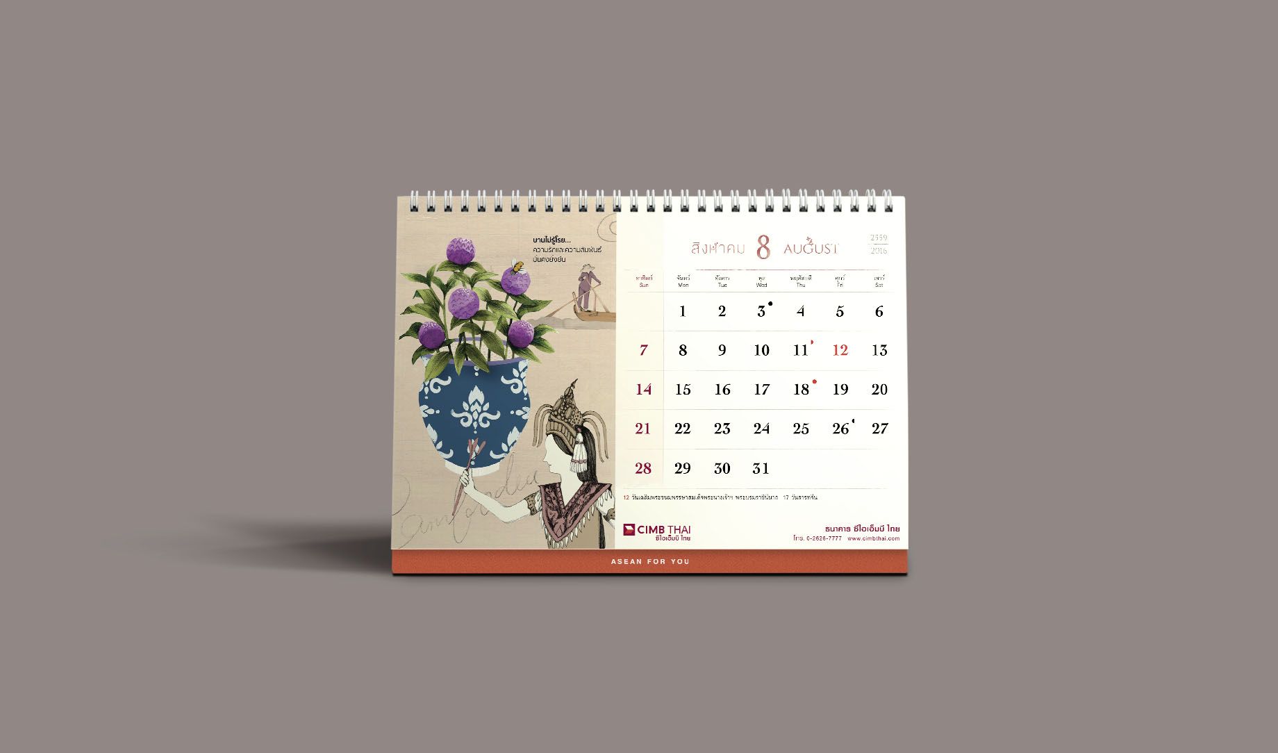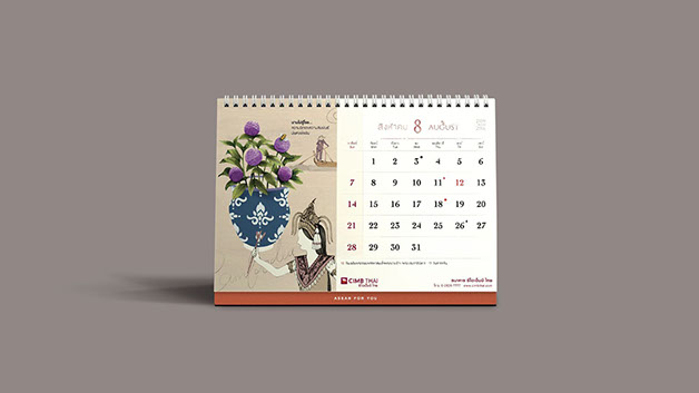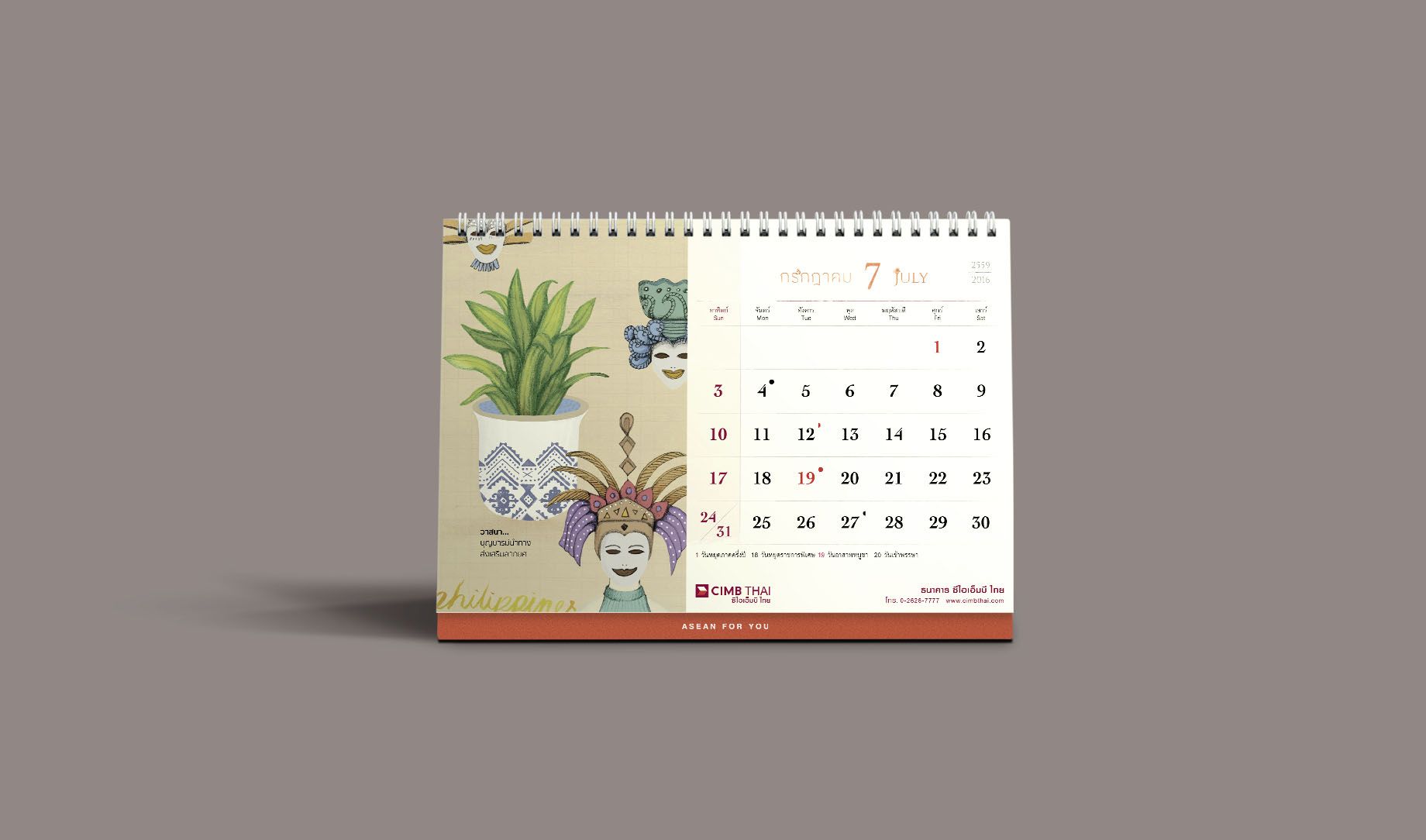 To succeed in banking and financial business, it needs tremendous care and attention to detail, similar to the foundation of planting. The practice of cultivating plants involves the best understanding in different types of plants, the land and its kind of soil, how to improve and amend your soil to branch out and yield fruitful success. We paired up these two stories of cultivation and came up with a visually pleasing calendar design. The calendar features hand-painted illustrations of Thai sacred plants in each month representing the Bank customers that beautifully flourish in different land, whereas the surface pattern and colour of the vase is inspired by traditional local arts used in everyday objects such as the pattern of ceramic floor tiles in Melaka or Vietnamese porcelain cup. The illustration introduces the unique features of each ASEAN country, national costume, arts, crafts and landmarks to imply that CIMB Thai know ASEAN best.
