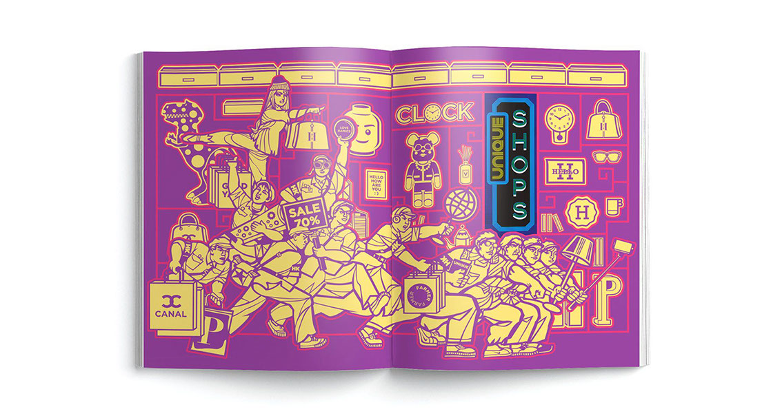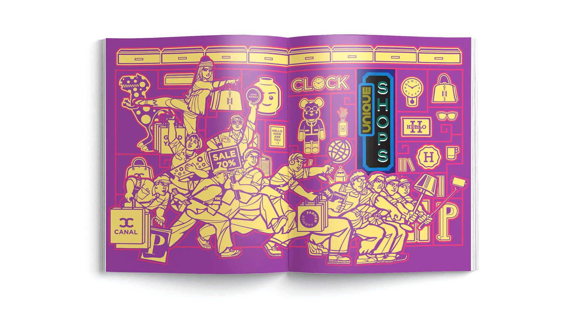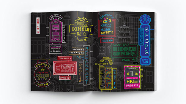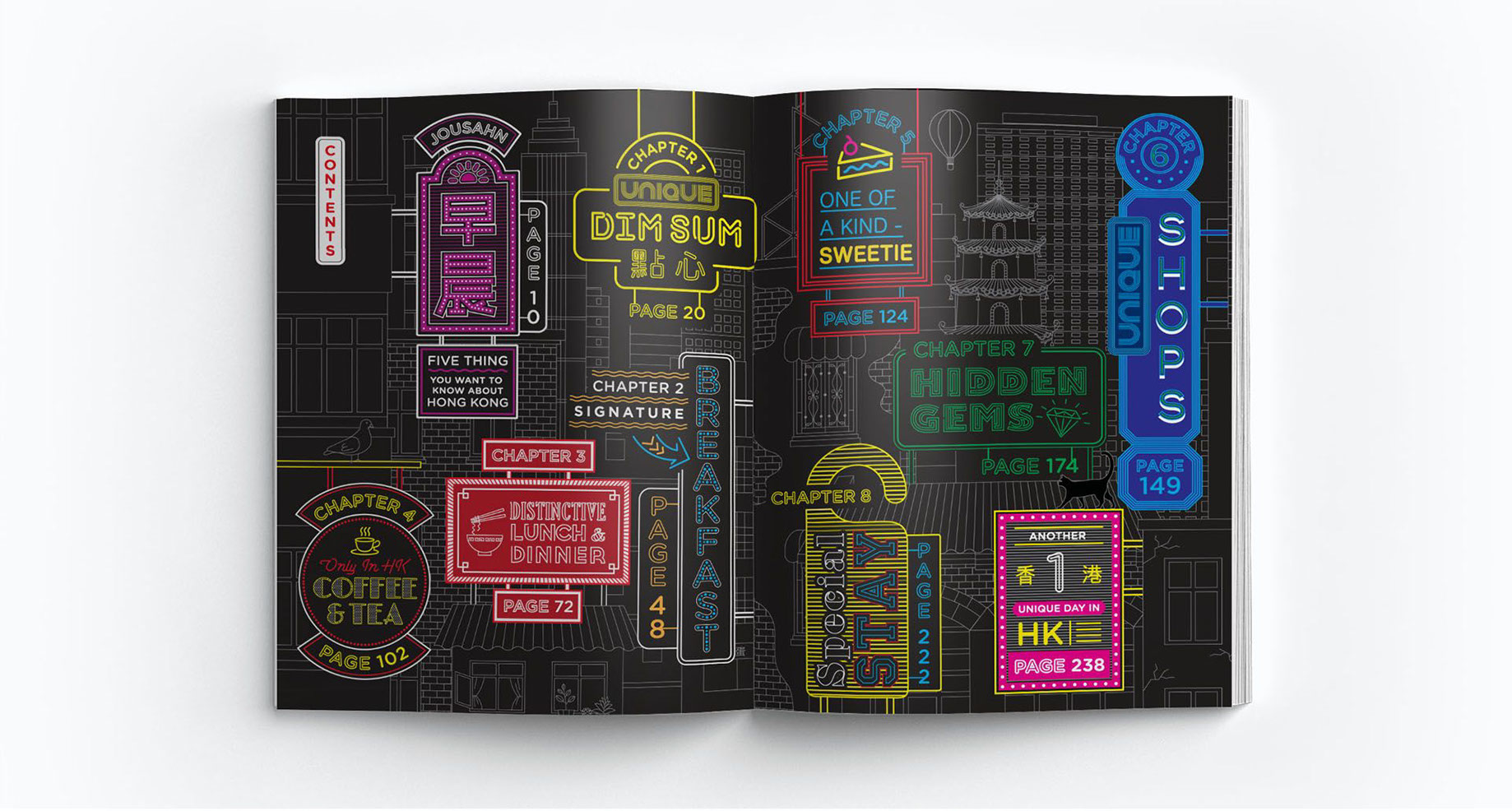Unique Hong Kong is a travel guide book on the premise that it will lead you to the new inspiring places through the eyes of a guru. It is an ultimate resource for travelers who want to experience Hong Kong in a new and unique way. We captured the essence of this guide book and vividly portrayed through a series of bold illustrations. Each section employed different styles of illustration making connections between objects and popular Hong Kong culture. Words include one of a kind, signature, hidden gems, special, distinctive and only were used to strengthen the idea of unique and displayed resemblingly as clutter street neon signs in Hong Kong.